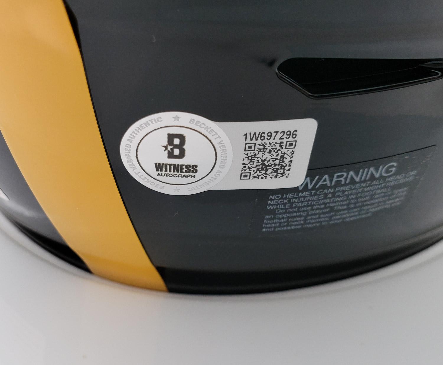This autographed Riddell mid size MIDI helmet has been personally hand-signed by Terry Bradshaw of the Pittsburgh Steelers. This autograph is certified by Beckett Authentication Services (BAS) Witness Certification. That means that a Beckett representative was present when this item was signed. It comes with the numbered authentication hologram with a QR code that verifies the authentication on the Beckett website.