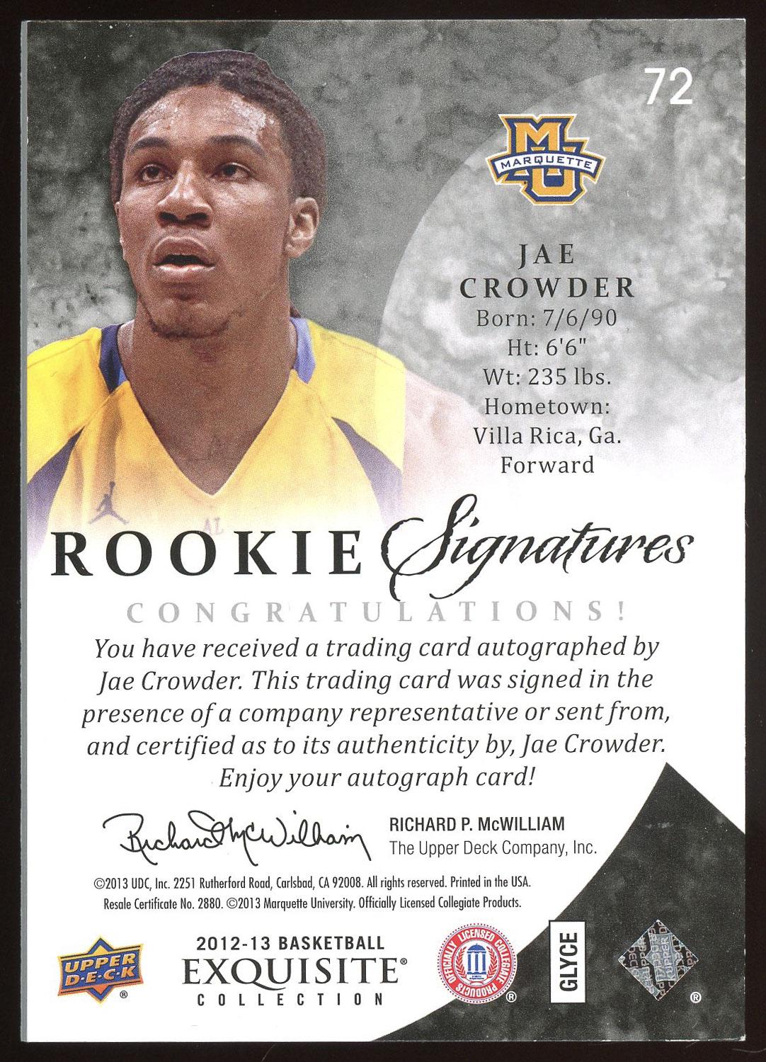 Jae Crowder 2012 Upper Deck Exquisite Rookie Signatures Autograph Card 51/199! Please see pictures for details on the condition of this card.