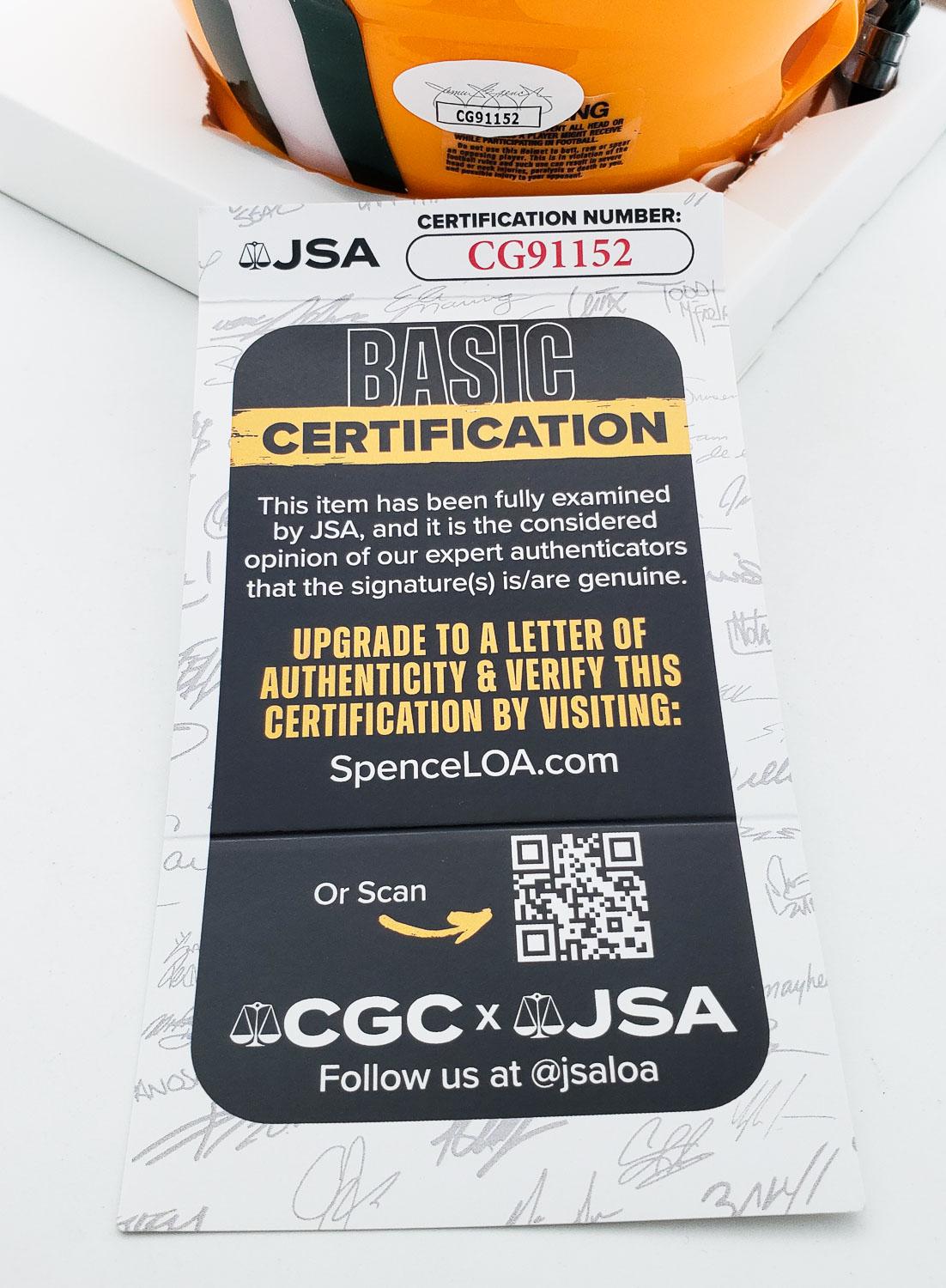 This autographed Riddell Speed mini helmet has been personally hand-signed by Jordan Love of the Green Bay Packers. This autograph is certified by James Spence Authentication (JSA). It comes with the numbered hologram and matching Certificate of Authenticity. Stock images are used for this listing. The item you will receive will be of equal quality to the one pictured. The signature location may vary slightly.
