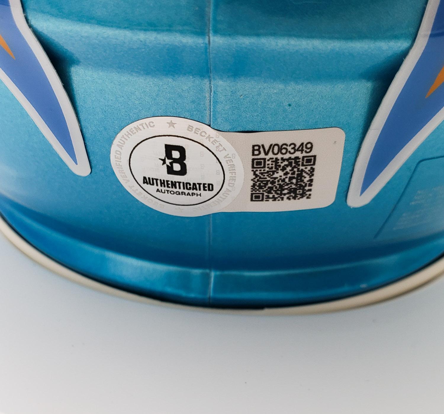 This autographed Riddell Speed mini helmet has been personally hand-signed by Justin Herbert "2020 NFL ROY" of the Los Angeles Chargers. This autograph is certified by Beckett Authentication Services (BAS). It comes with the numbered authentication hologram with a QR code that verifies the authentication on the Beckett website. Stock images are used for this listing. The item you will receive will be of equal quality to the one pictured. The signature location may vary slightly.