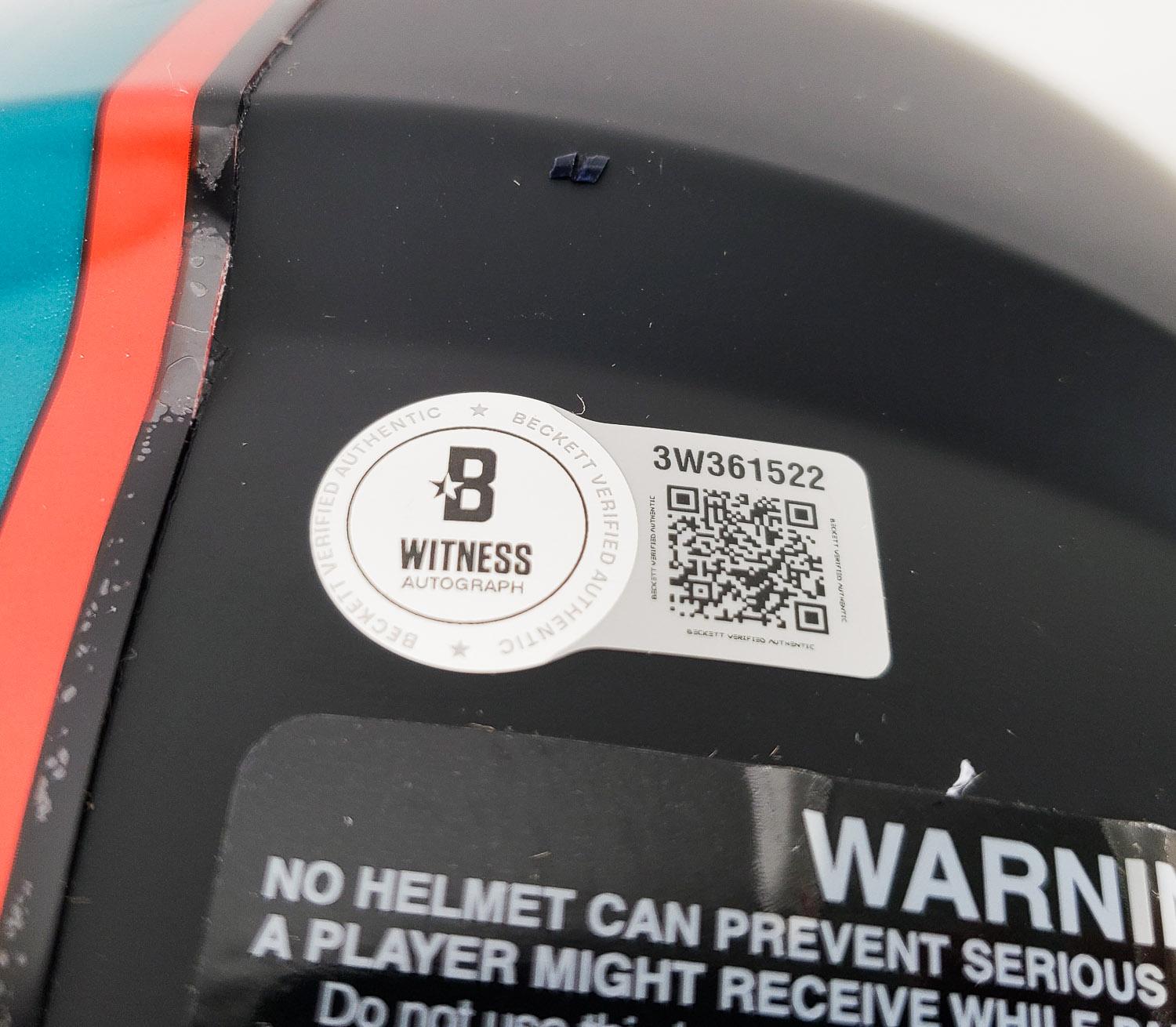 This autographed full size Riddell authentic speed helmet has been personally hand-signed by Dan Marino of the Miami Dolphins. This autograph is certified by Beckett Authentication Services (BAS) Witness Certification. That means that a Beckett representative was present when this item was signed. It comes with the numbered authentication hologram with a QR code that verifies the authentication on the Beckett website.