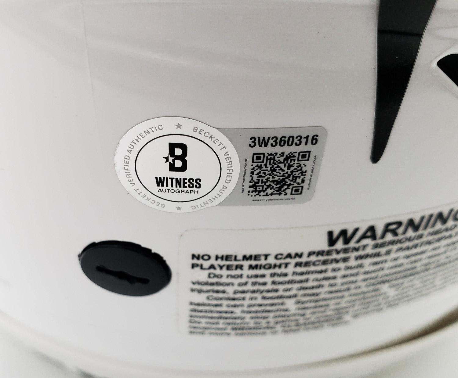 This autographed full size Riddell SpeedFlex authentic helmet has been personally hand-signed by Ja'Marr Chase of the Cincinnati Bengals. This autograph is certified by Beckett Authentication Services (BAS) Witness Certification. That means that a Beckett representative was present when this item was signed. It comes with the numbered authentication hologram with a QR code that verifies the authentication on the Beckett website.