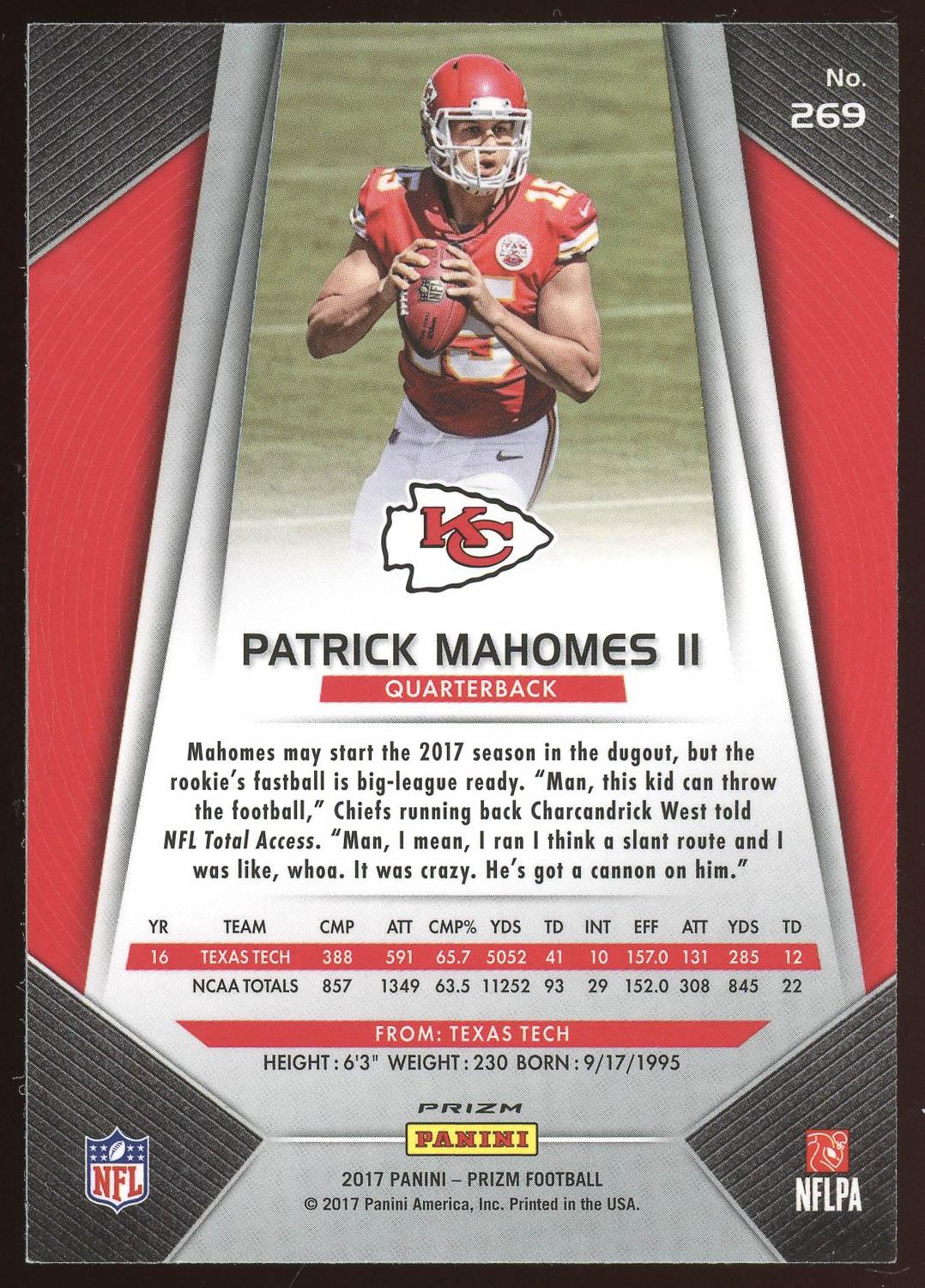 Patrick Mahomes II 2017 Panini Prizm Red, White, Blue Rookie Card #269. Please see pictures for details on the condition of this card.