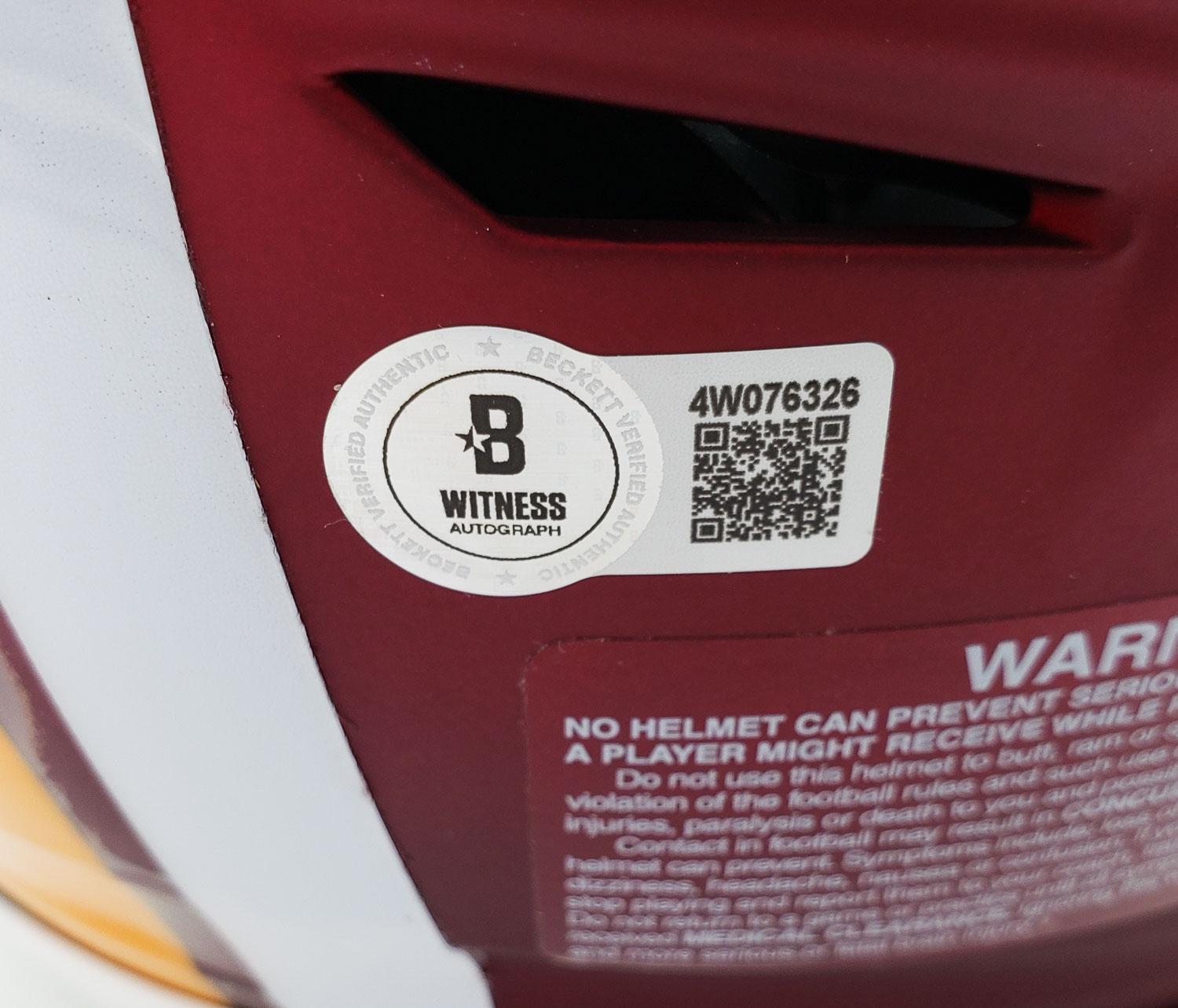 This autographed full size Riddell SpeedFlex authentic helmet has been personally hand-signed by Terry McLaurin of the Washington Commanders. This autograph is certified by Beckett Authentication Services (BAS) Witness Certification. That means that a Beckett representative was present when this item was signed. It comes with the numbered authentication hologram with a QR code that verifies the authentication on the Beckett website.