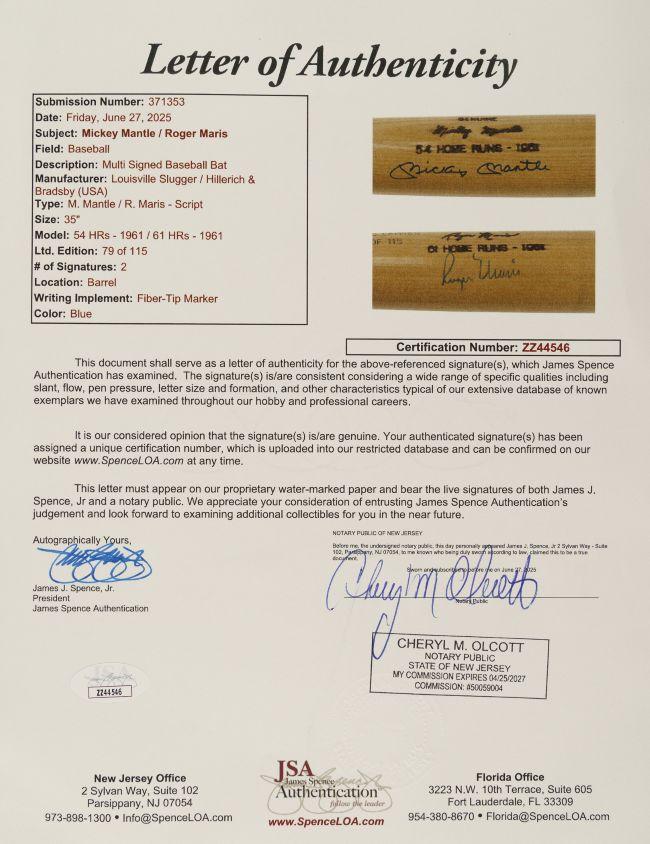 This autographed bat has been personally hand-signed by Mickey Mantle & Roger Maris of the New York Yankees. The Lousiville Slugger stamping is on both sides of the bat and each side represents the home run totals for each player during the historic 1961 season. These autographs are certified by James Spence Authentication (JSA). It comes with the numbered hologram and matching Letter of Authenticity.