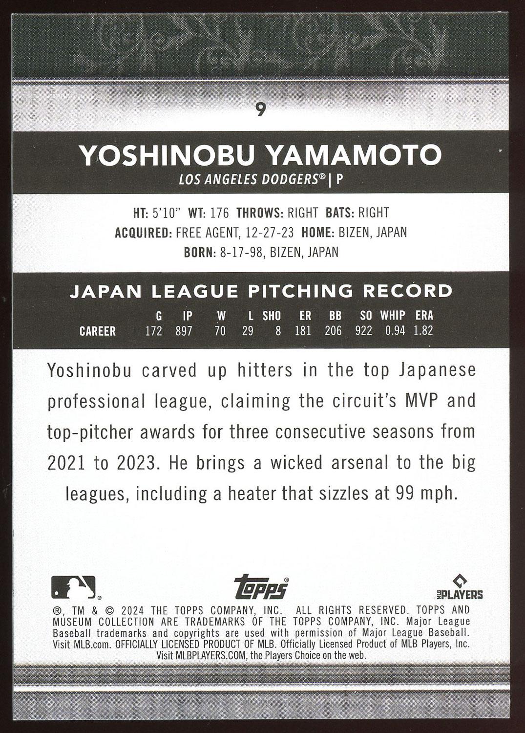 Yoshinobu Yamamoto 2024 Topps Museum Collection Card 189/199!
