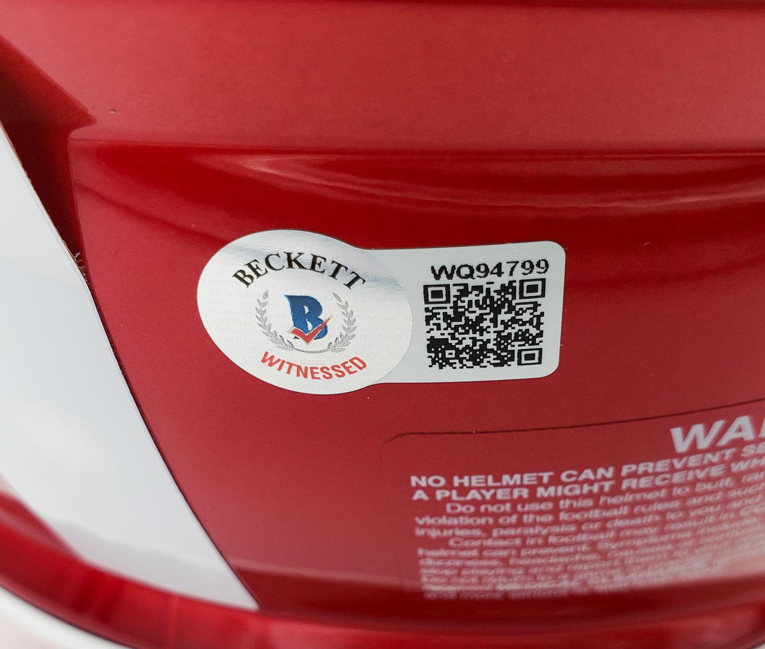 This autographed full size Riddell Authentic Speed helmet has been personally hand-signed by Herschel Walker "82 Heisman" of the Georgia Bulldogs. This autograph is certified by Beckett Authentication Services (BAS) Witness Certification. That means that a Beckett representative was present when this item was signed. It comes with the numbered authentication hologram with a QR code that verifies the authentication on the Beckett website.