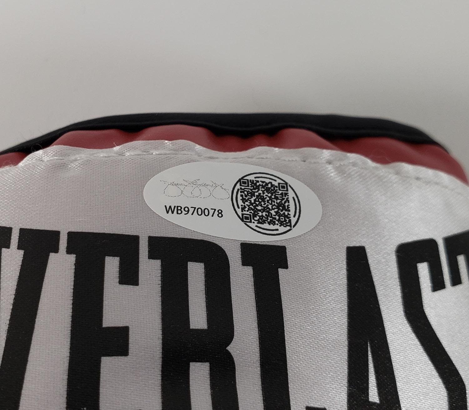 This autographed Everlast boxing glove has been personally hand-signed by Mike Tyson. This autograph is certified by James Spence Authentication's (JSA) Witnessed Protection Program. That means that a JSA representative was present when this item was signed. It comes with the numbered authentication hologram with a QR code that verifies the authentication on the JSA website.