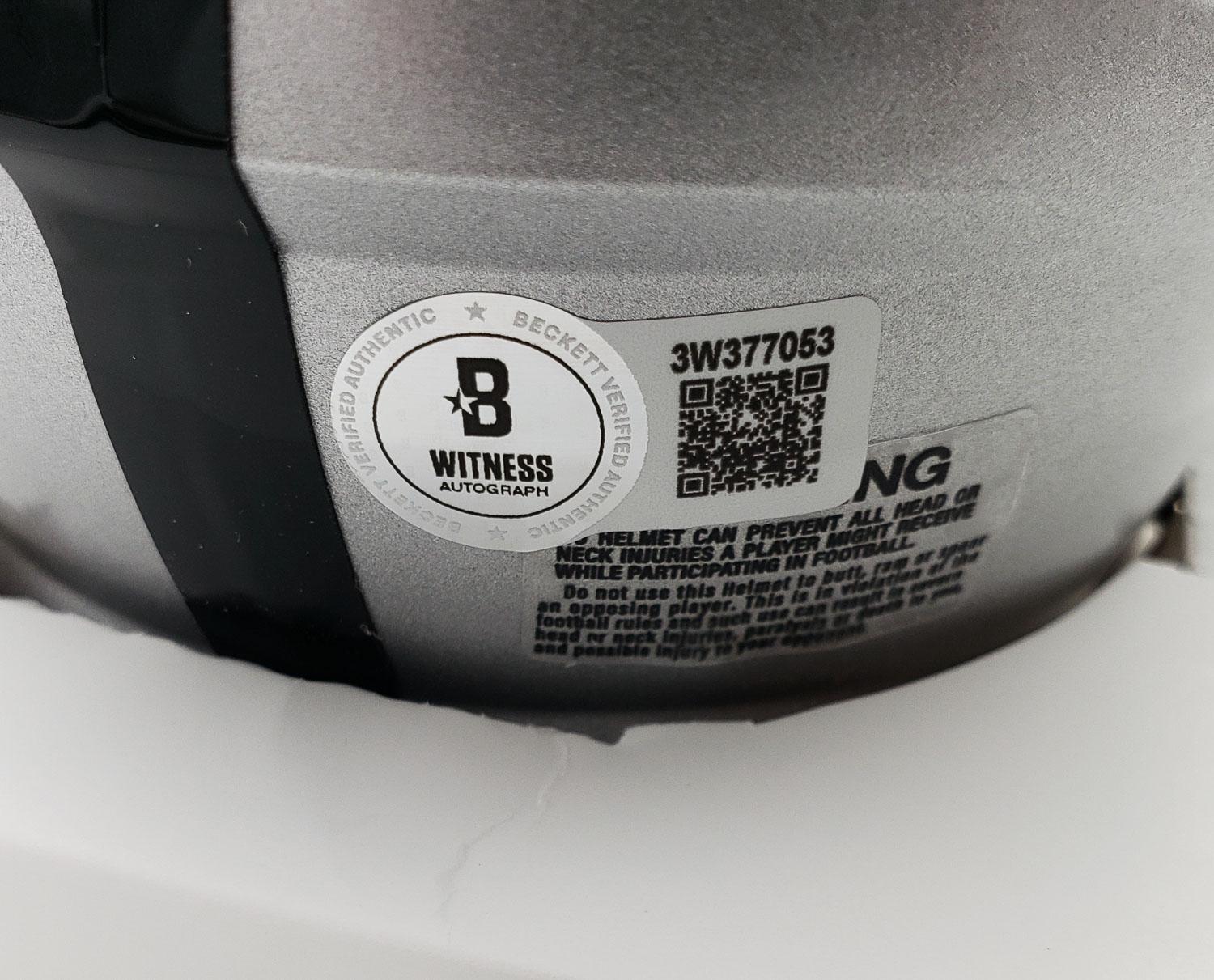 This autographed Riddell Speed mini helmet has been personally hand-signed by Bo Jackson of the Oakland Raiders. This autograph is certified by Beckett Authentication Services (BAS) Witness Certification. That means that a Beckett representative was present when this item was signed. It comes with the numbered authentication hologram with a QR code that verifies the authentication on the Beckett website.
