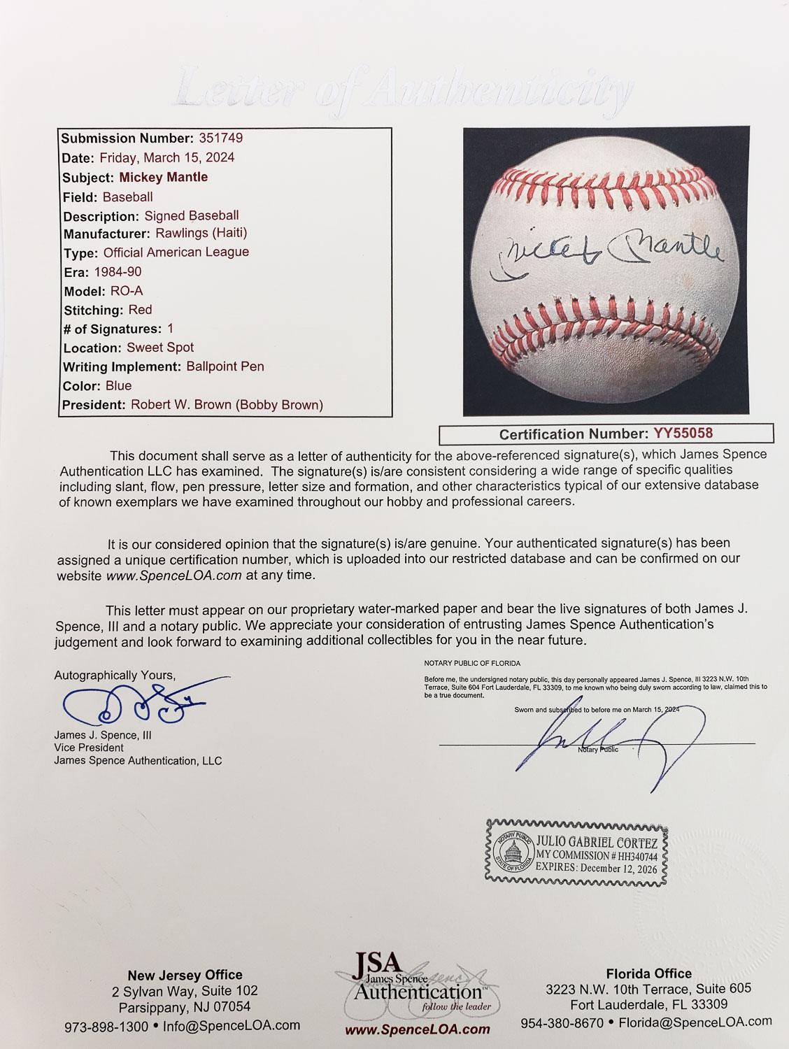 This autographed baseball has been personally hand-signed by Mickey Mantle of the New York Yankees. This autograph is certified by James Spence Authentication (JSA). It comes with the numbered hologram and matching Letter of Authenticity.
