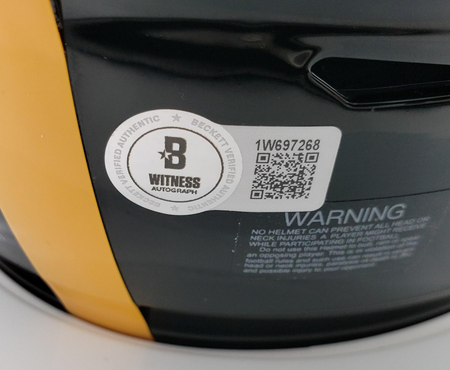 This autographed Riddell mid size MIDI helmet has been personally hand-signed by Terry Bradshaw of the Pittsburgh Steelers. This autograph is certified by Beckett Authentication Services (BAS) Witness Certification. That means that a Beckett representative was present when this item was signed. It comes with the numbered authentication hologram with a QR code that verifies the authentication on the Beckett website.