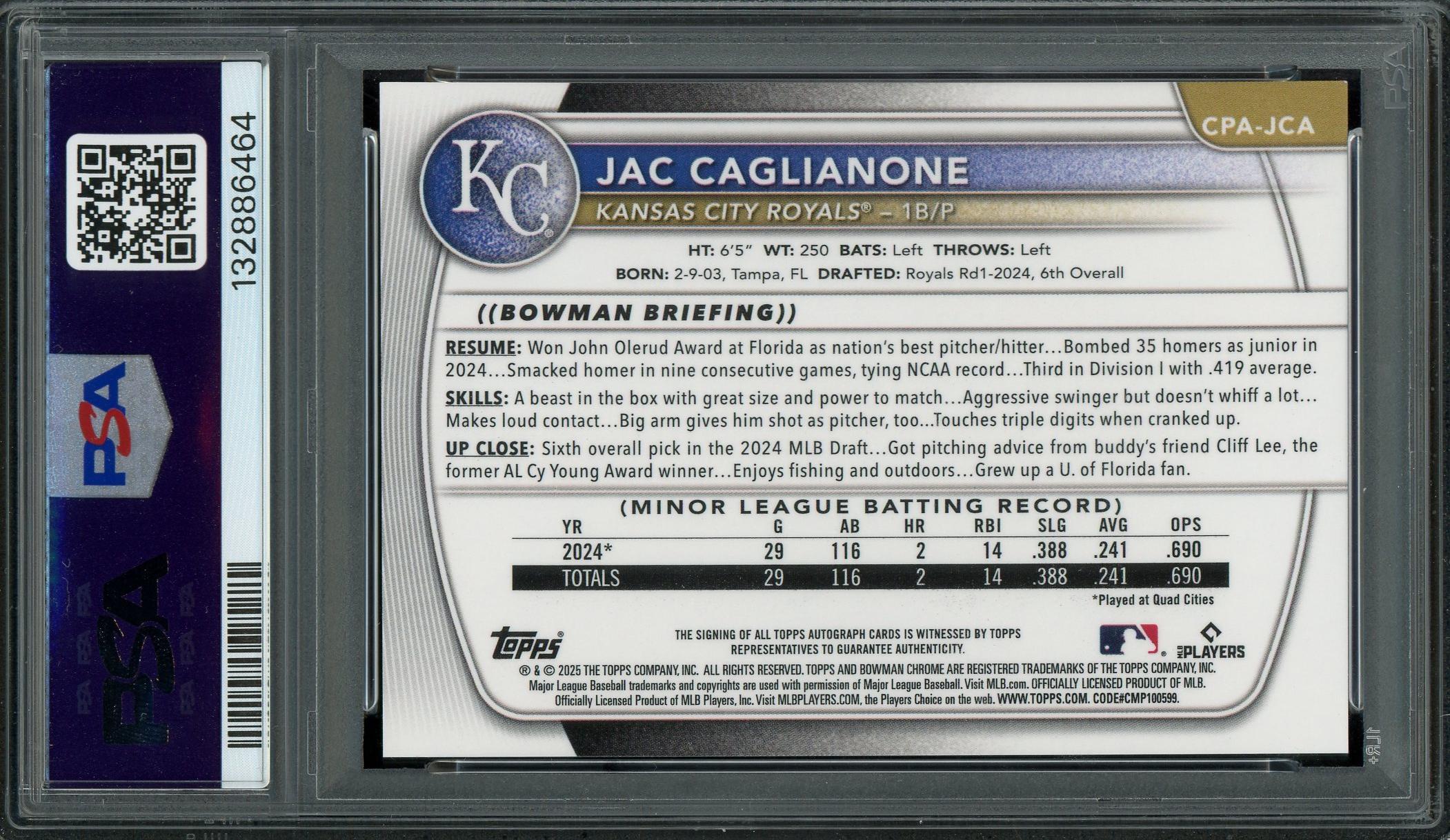 Jac Caglianone 2025 Bowman Chrome Prospect Autograph Card PSA 9