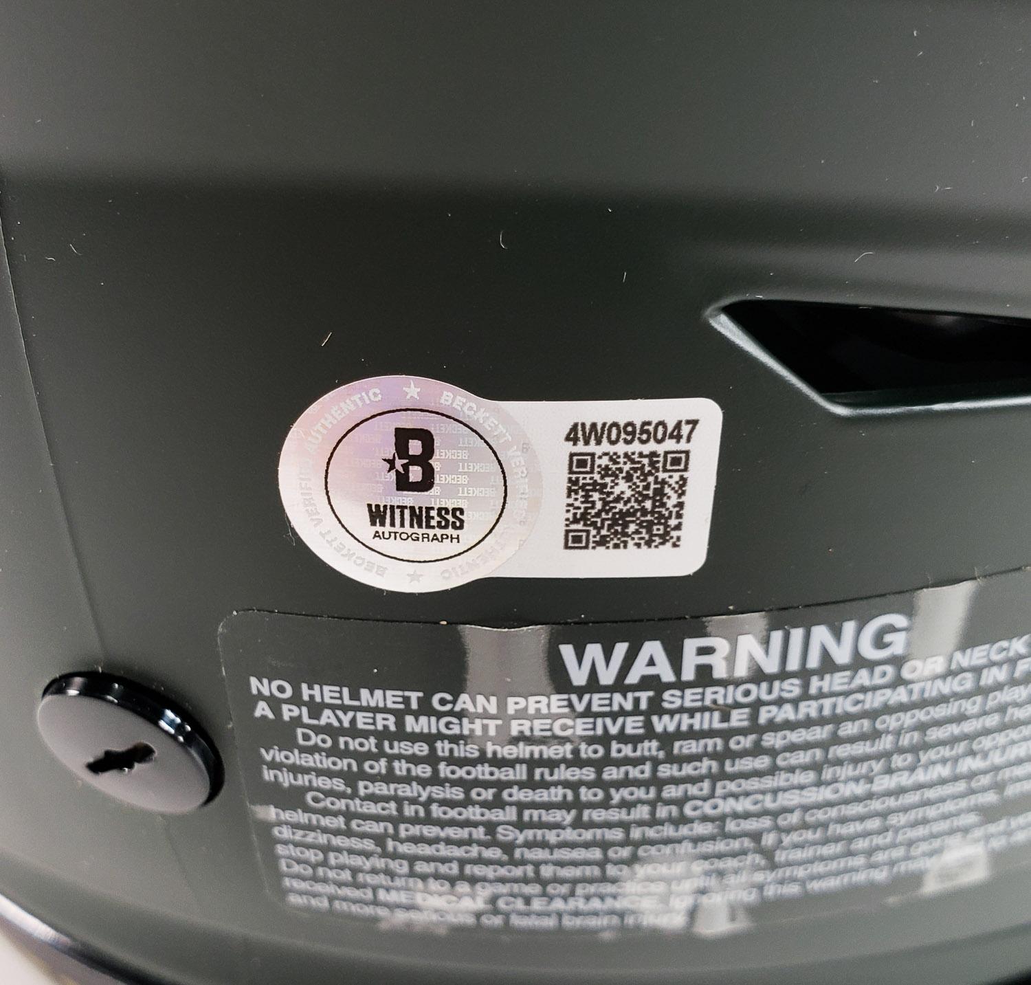 This autographed full size Riddell SpeedFlex authentic speed helmet has been personally hand-signed by Jordan Love of the Green Bay Packers. This autograph is certified by Beckett Authentication Services (BAS) Witness Certification. That means that a Beckett representative was present when this item was signed. It comes with the numbered authentication hologram with a QR code that verifies the authentication on the Beckett website.