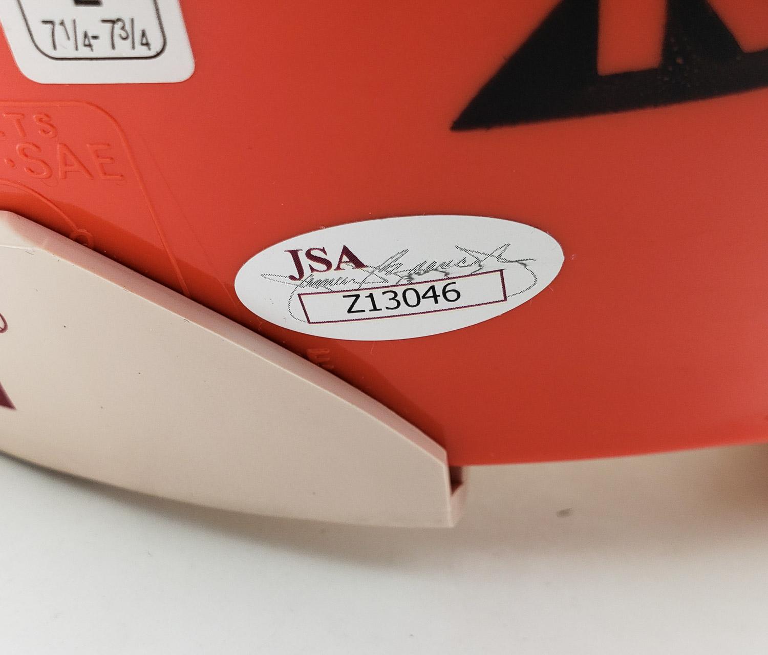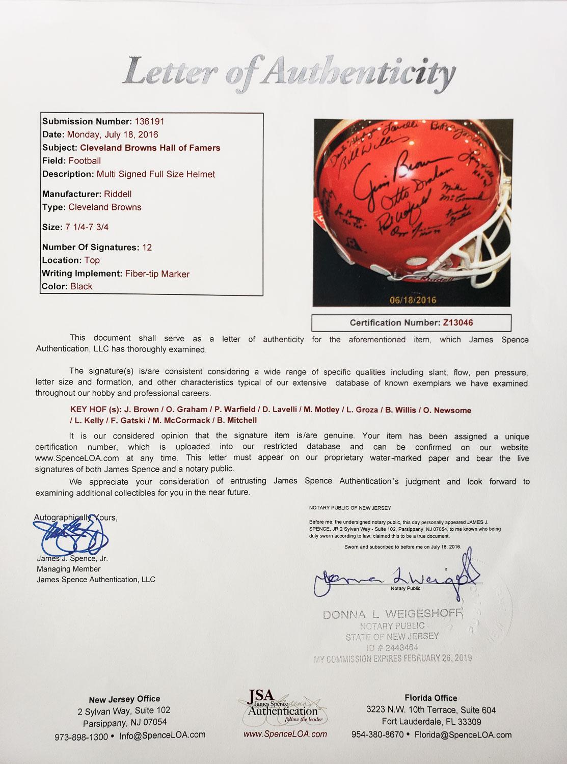 This autographed full size authentic helmet has been personally hand-signed by 12 Cleveland Browns Hall of Famers. Signature include Jim Brown, Otto Graham, Paul Warfield, Dante Lavelli, M. Motley, Lou Groza, B. Willis, Ozzie Newsome, Leroy Kelly, F. Gatski, M. McCormack and B. Mitchell. These autographs are certified by James Spence Authentication (JSA). It comes with the numbered hologram and matching Letter of Authenticity.