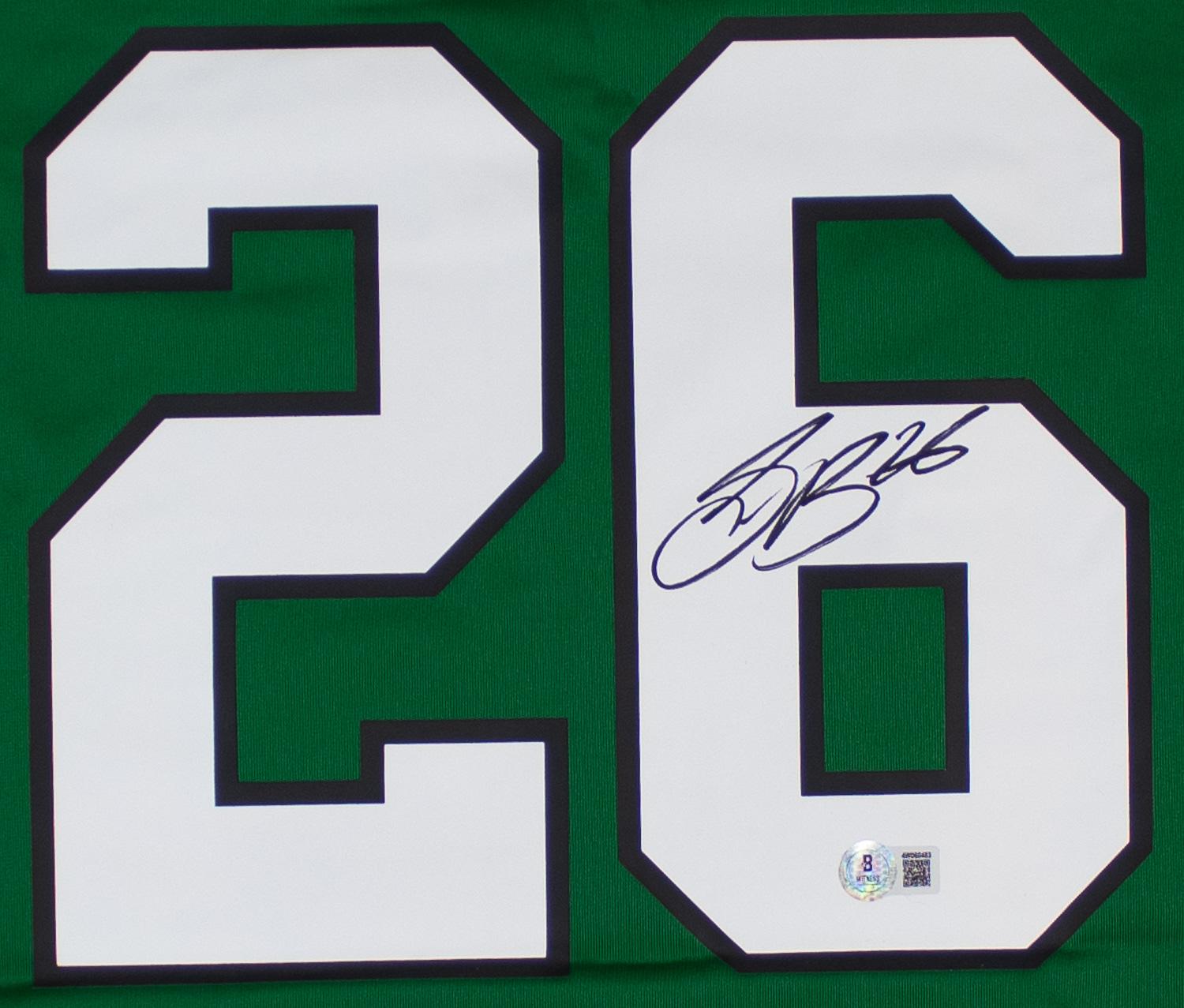 This autographed Nike jersey has been personally hand-signed by Saquon Barkley of the Philadelphia Eagles. This autograph is certified by Beckett Authentication Services (BAS) Witness Certification. That means that a Beckett representative was present when this item was signed. It comes with the numbered authentication hologram with a QR code that verifies the authentication on the Beckett website.