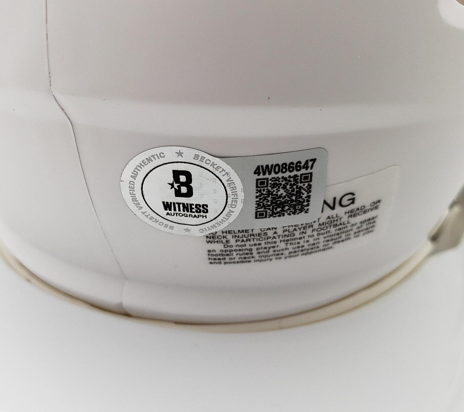 This autographed Riddell Rave Collection Speed mini helmet has been personally hand-signed by Travis Hunter of the Jacksonville Jaguars. This autograph is certified by Beckett Authentication Services (BAS) Witness Certification. That means that a Beckett representative was present when this item was signed. It comes with the numbered authentication hologram with a QR code that verifies the authentication on the Beckett website.