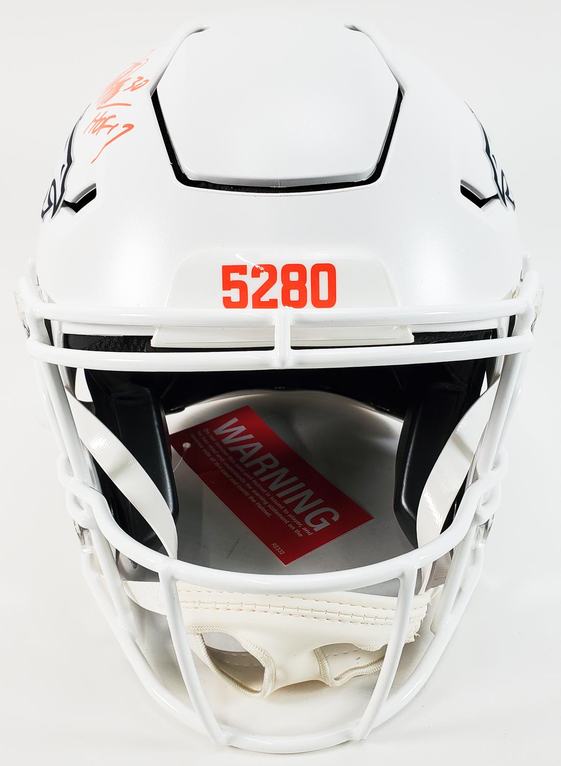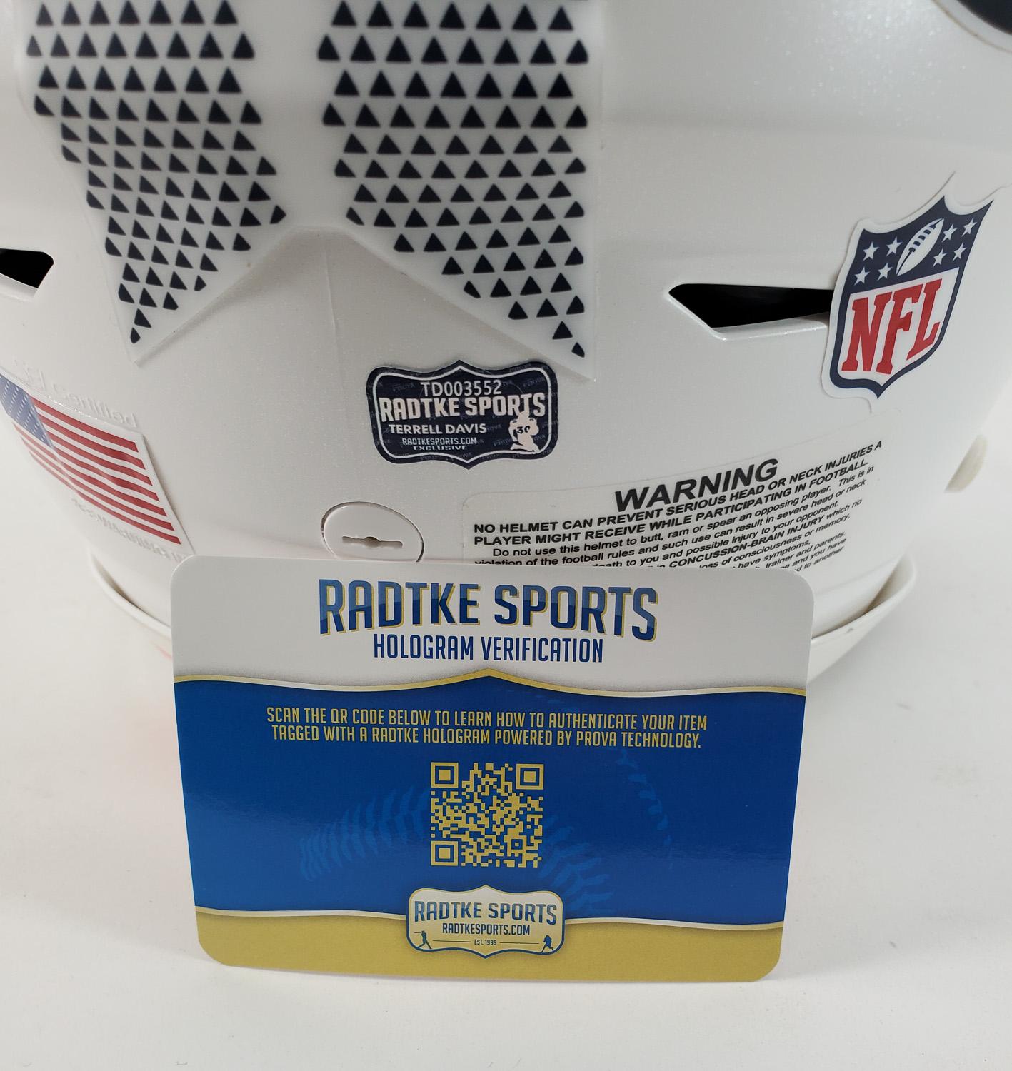 This autographed full size Riddell SpeedFlex authentic speed helmet has been personally hand-signed by Terrell Davis "HOF 17" of the Denver Broncos. This autograph is certified by Radtke Sports. It comes with the numbered authentication hologram, which can be verified on their website, Radtkesports.com.