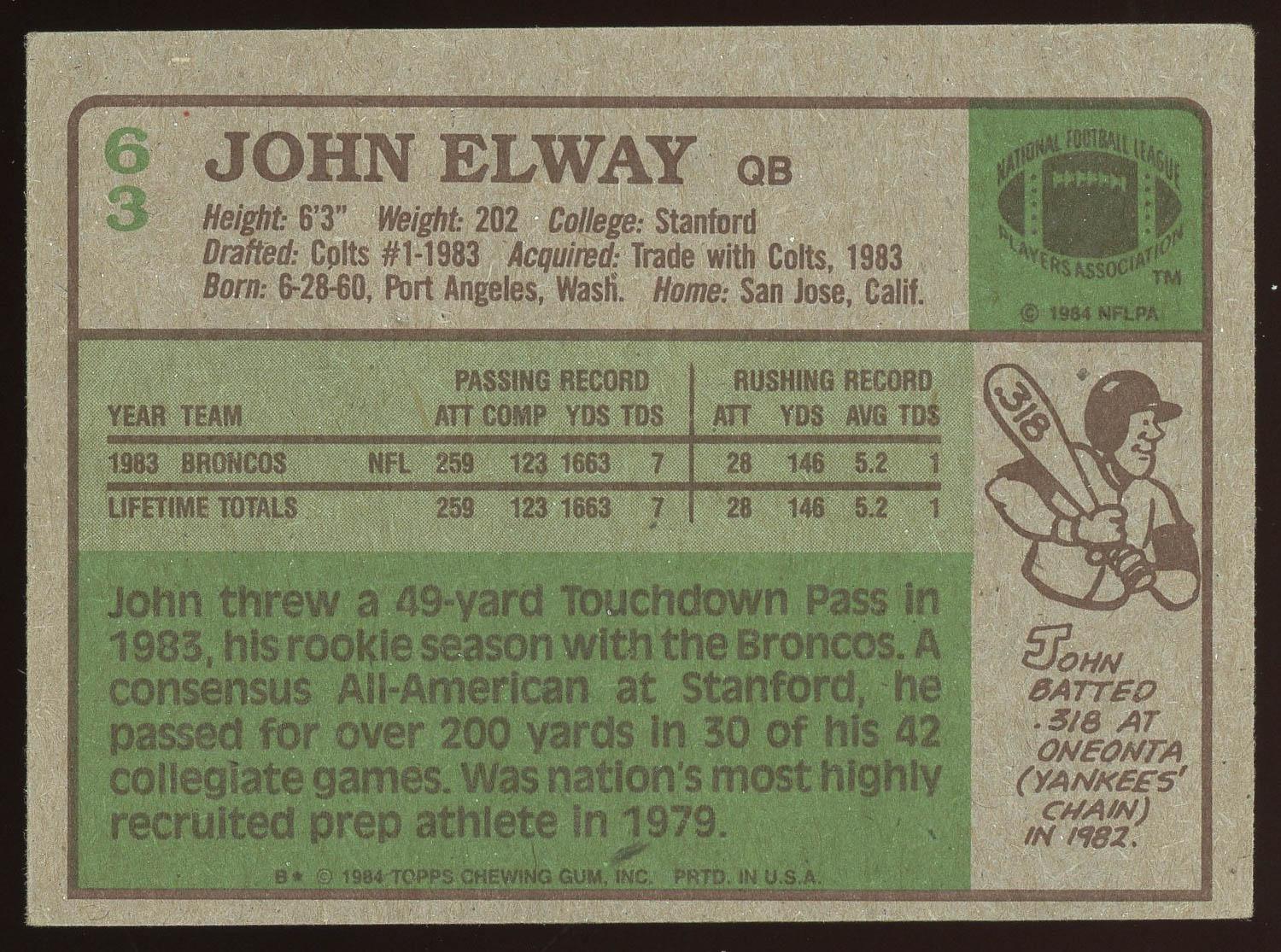 John Elway 1984 Topps Rookie Card #63. Please see pictures for details on the condition of this card.