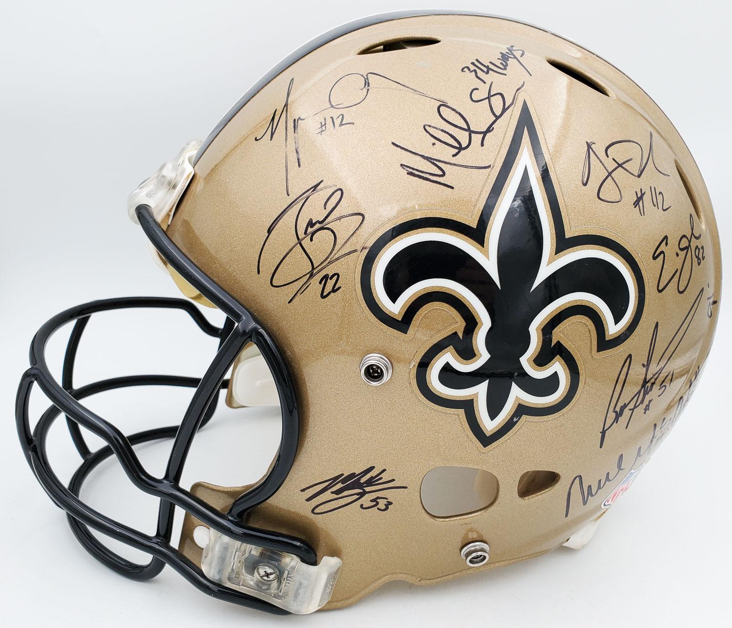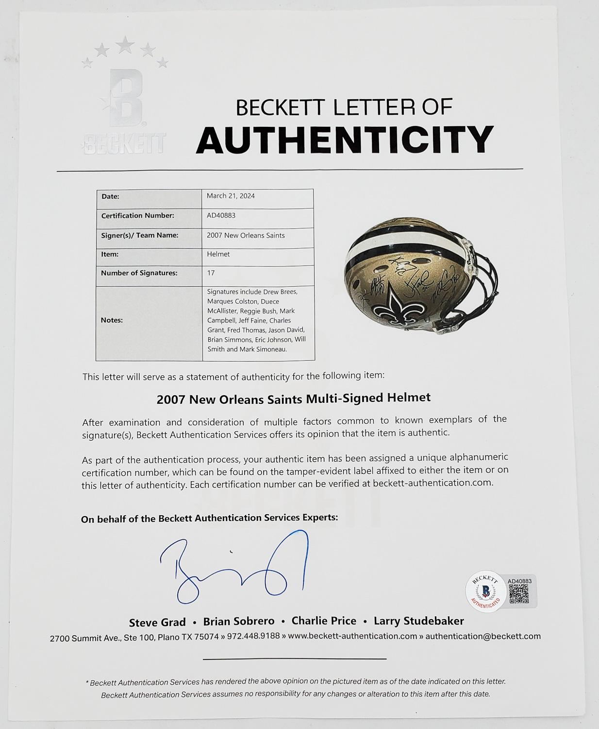 This autographed full size authentic helmet has been personally hand-signed by 17 members of the 2007 New Orleans Saints Team. Signatures include Drew Brees, Marques Colston, Duece McAllister, Reggie Bush, Mark Campbell, Jeff Faine, Charles Grant, Fred Thomas, Jason David, Brian Simmons, Eric Johnson, Will Smith, Mark Simoneau and more. These autographs are certified by Beckett Authentication Services (BAS). It comes with the numbered hologram and matching Letter of Authenticity.
