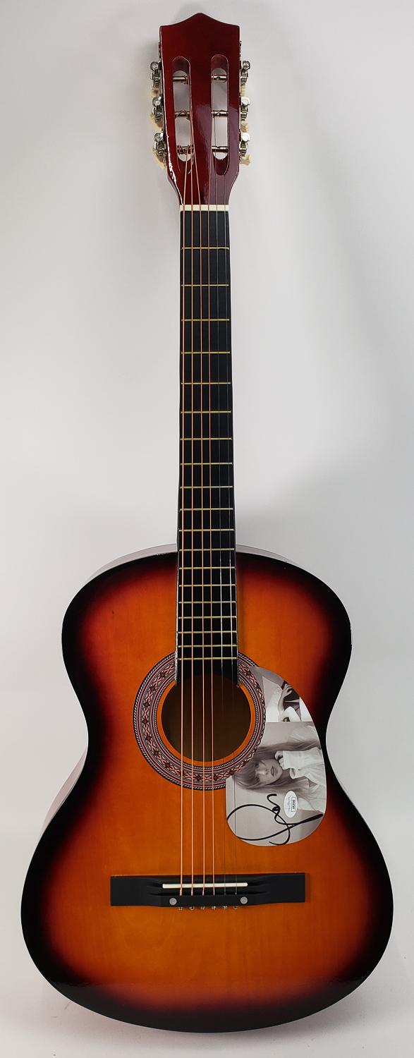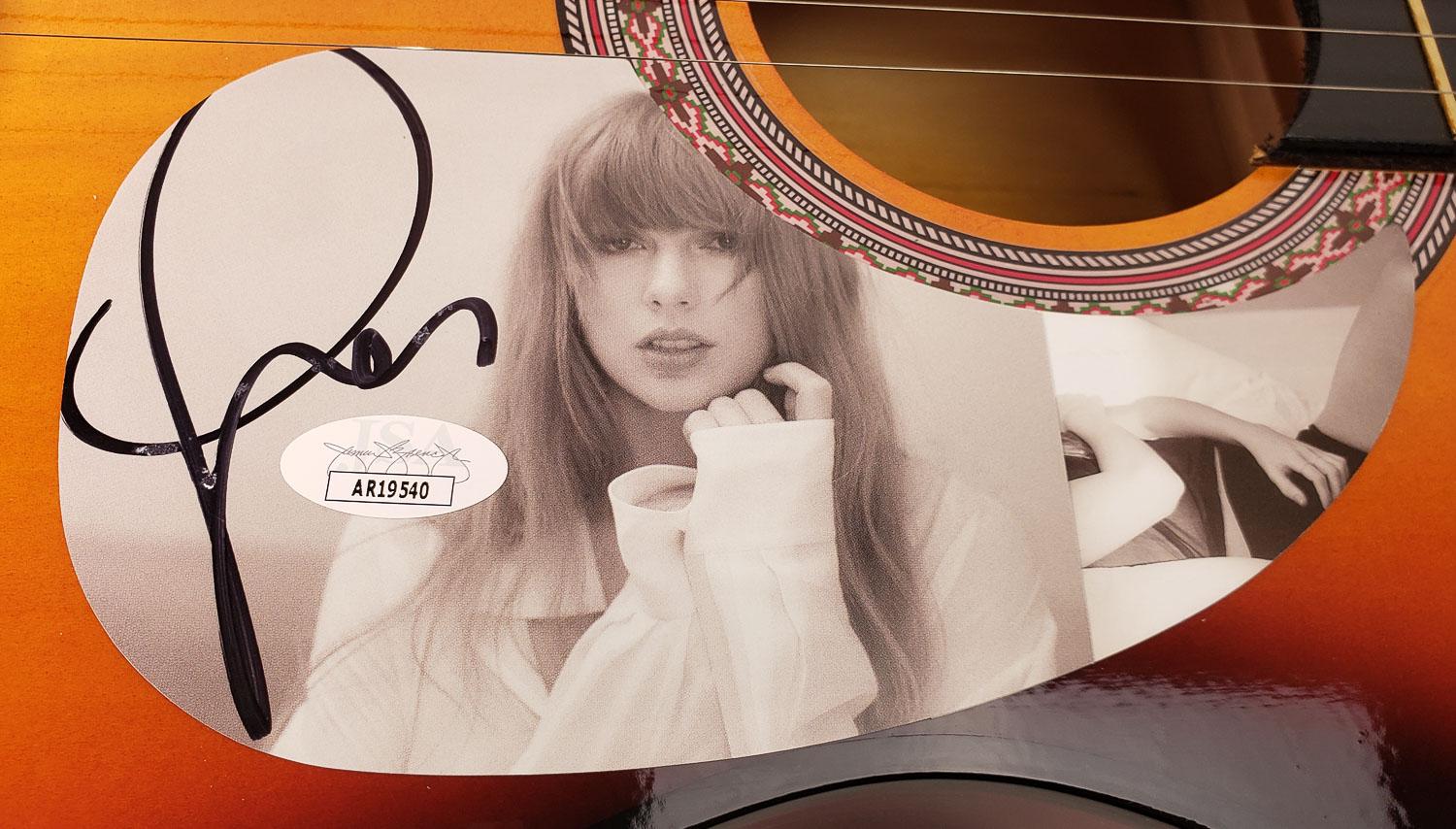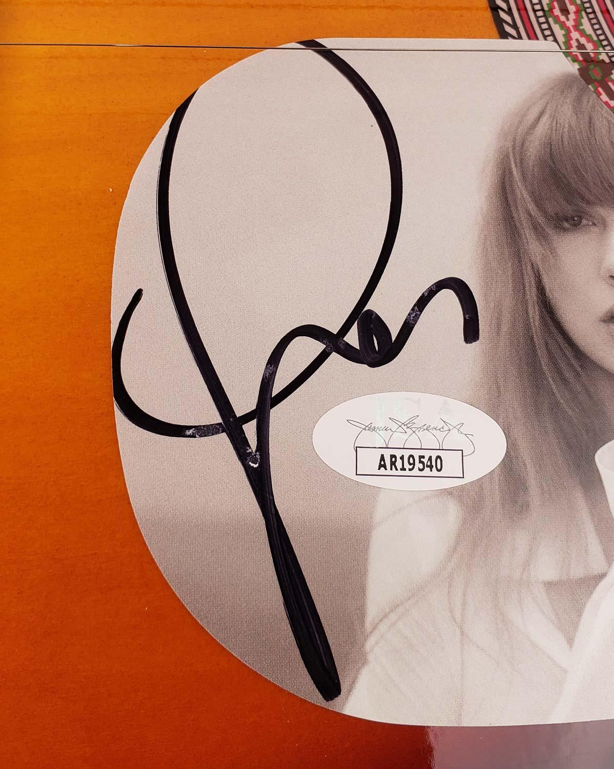 This autographed generic acoustic guitar has been personally hand-signed by Taylor Swift. This autograph is certified by James Spence Authentication (JSA). It comes with the numbered hologram for Authenticity. The signed pickguard is a cutout of a signed CD cover and part of another page glued together to make a pickguard shape.