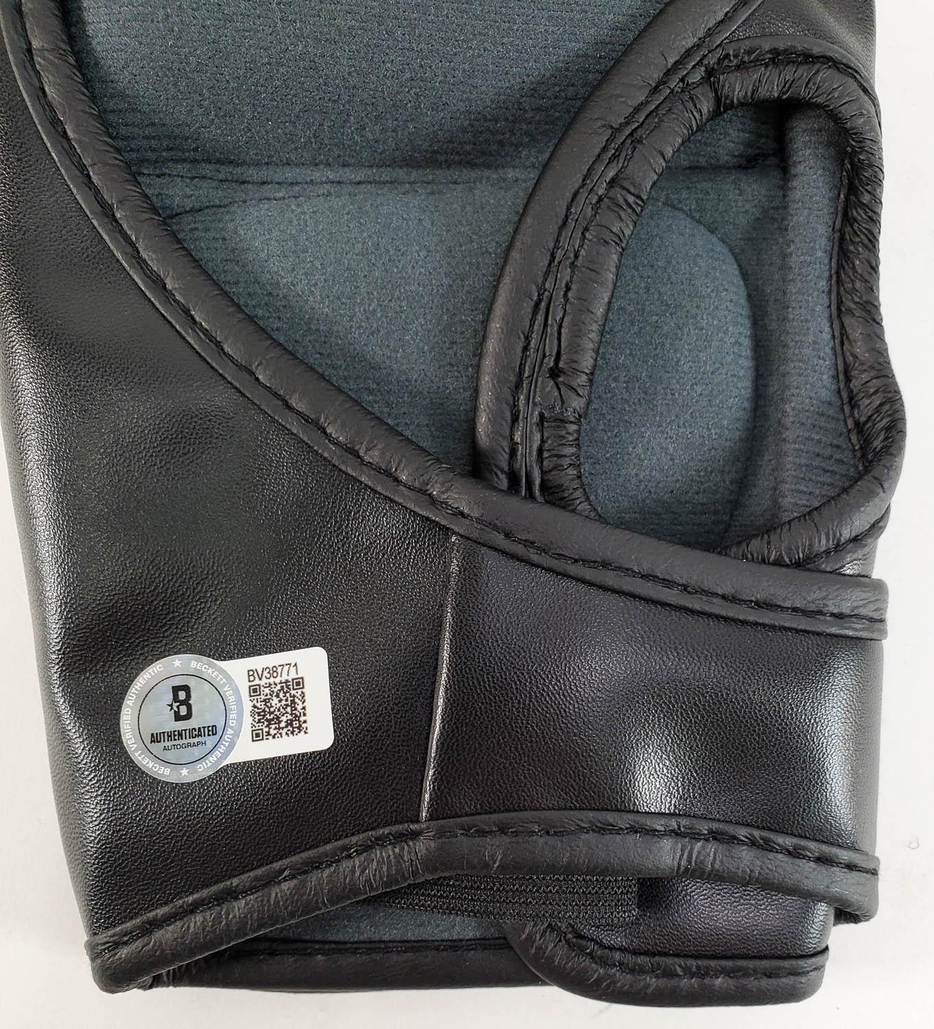 This autographed glove has been personally hand-signed by Conor McGregor. This autograph is certified by Beckett Authentication Services (BAS) Certification. It comes with the numbered authentication hologram with a QR code that verifies the authentication on the Beckett website.