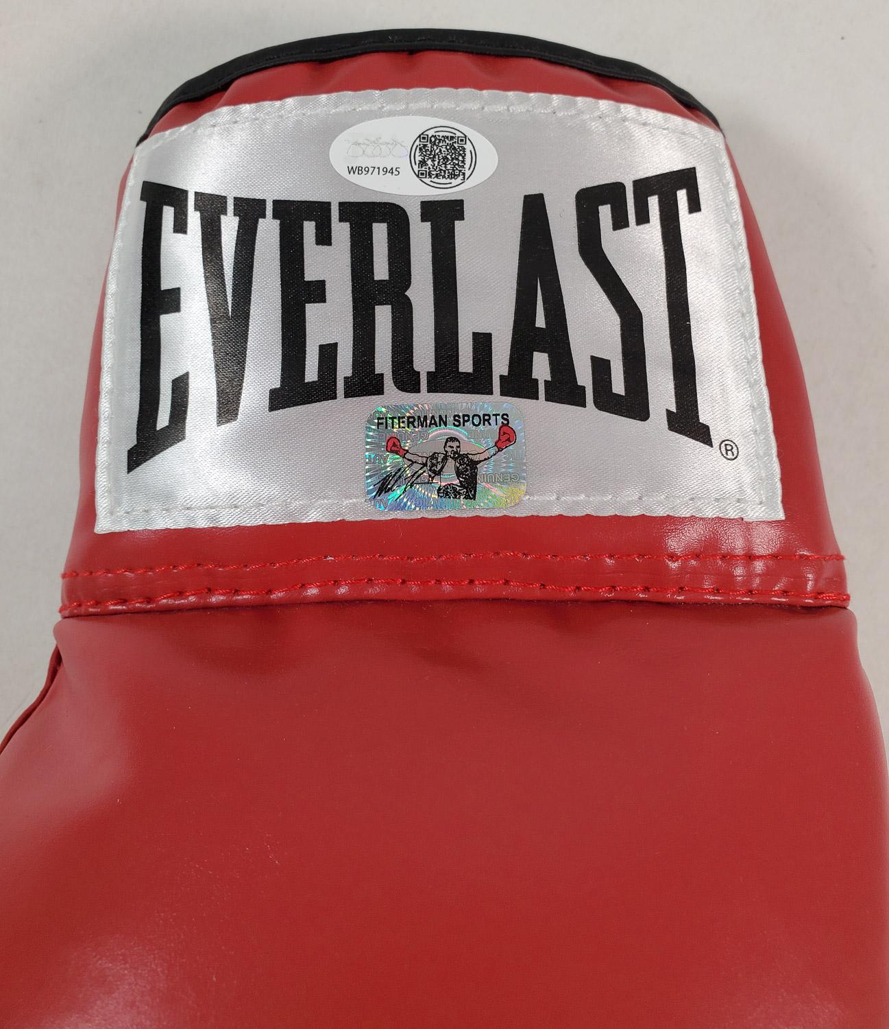 This autographed Everlast boxing glove has been personally hand-signed by Mike Tyson. This autograph is certified by James Spence Authentication's (JSA) Witnessed Protection Program. That means that a JSA representative was present when this item was signed. It comes with the numbered authentication hologram with a QR code that verifies the authentication on the JSA website.
