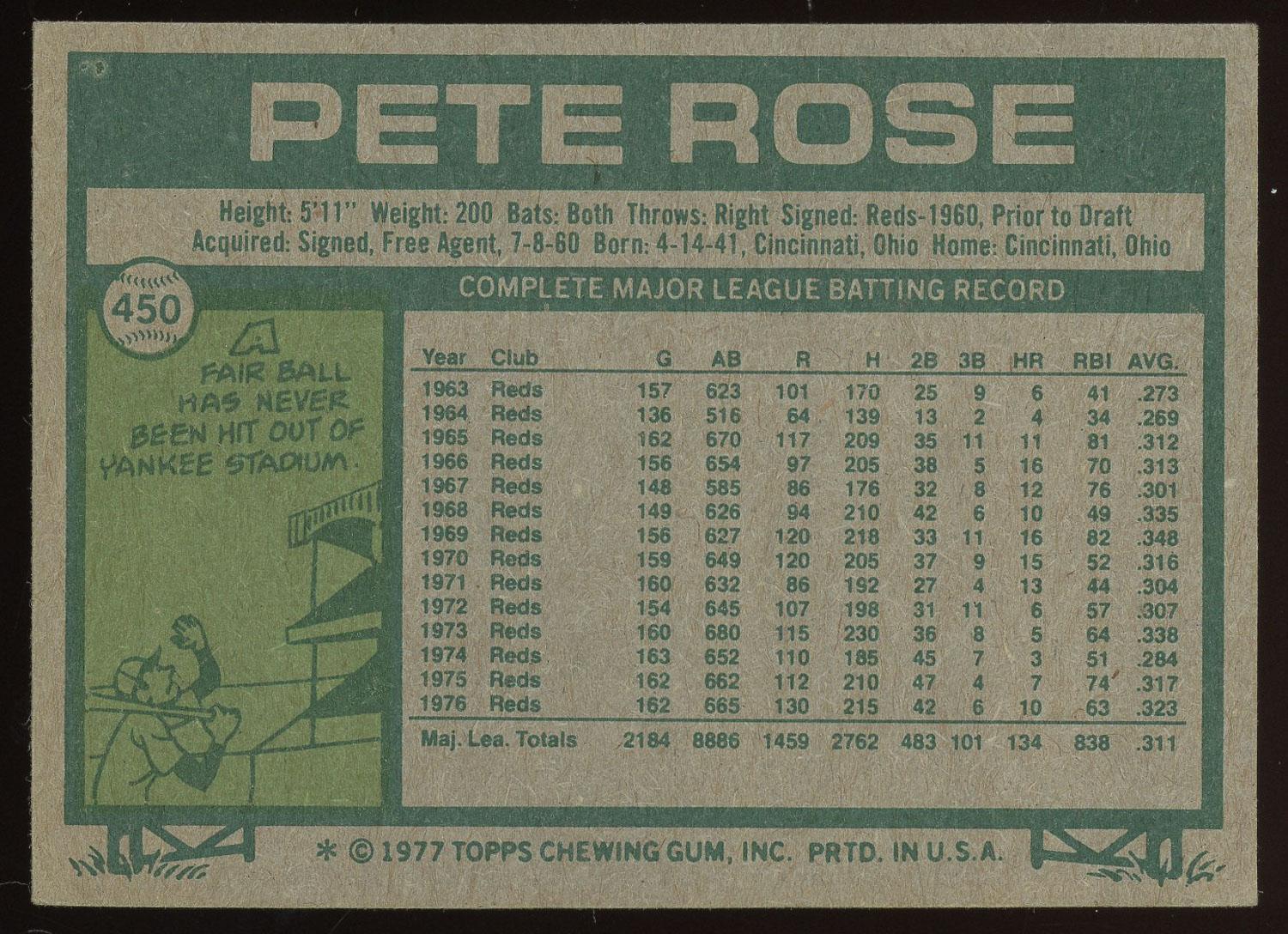 Pete Rose 1977 Topps Card #450. Please see pictures for details on the condition of this card.