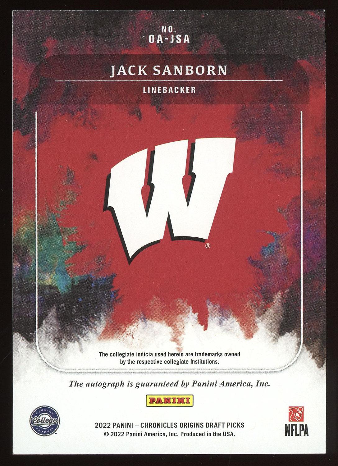 Jack Sanborn 2022 Panini Chronicles Origins Draft Picks Autograph Card. Please see pictures for details on the condition of this card.