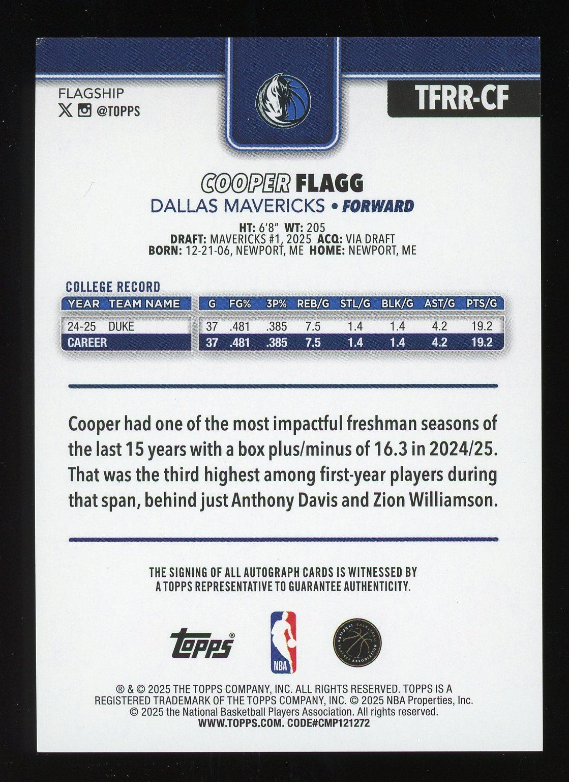 Cooper Flagg 2025 Topps Flagship Rookie Auto Card