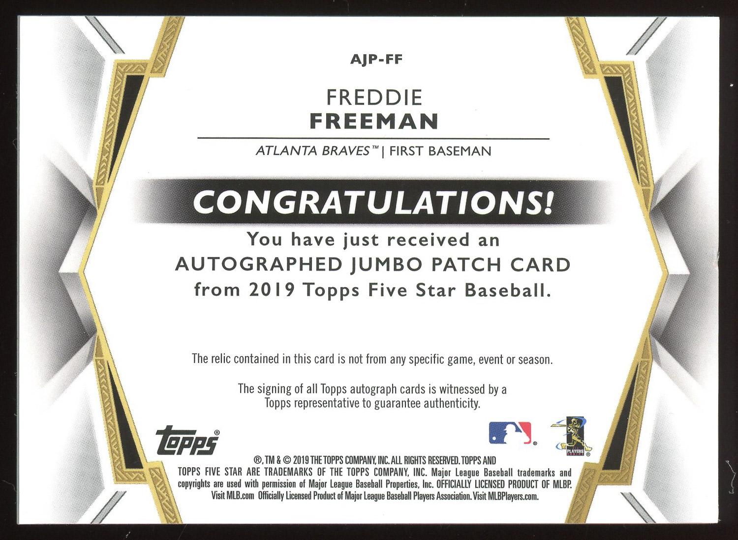Freddie Freeman 2019 Topps Five Star Jumbo Autograph Card /5. Please see pictures for details on the condition of this card.
