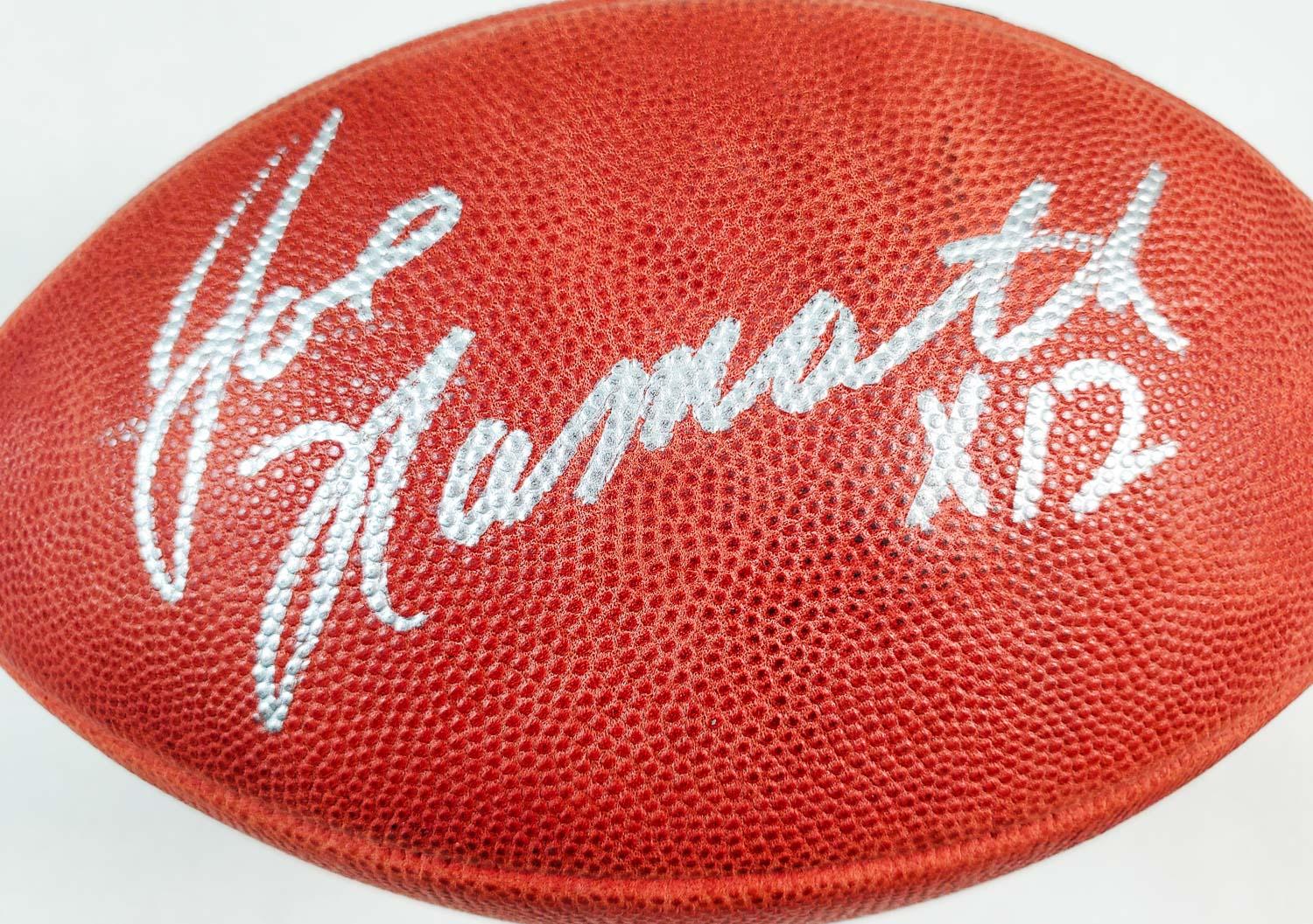 This autographed football has been personally hand-signed by Joe Namath of the New York Jets. This autograph is certified by Beckett Authentication Services (BAS). It comes with the numbered authentication hologram.