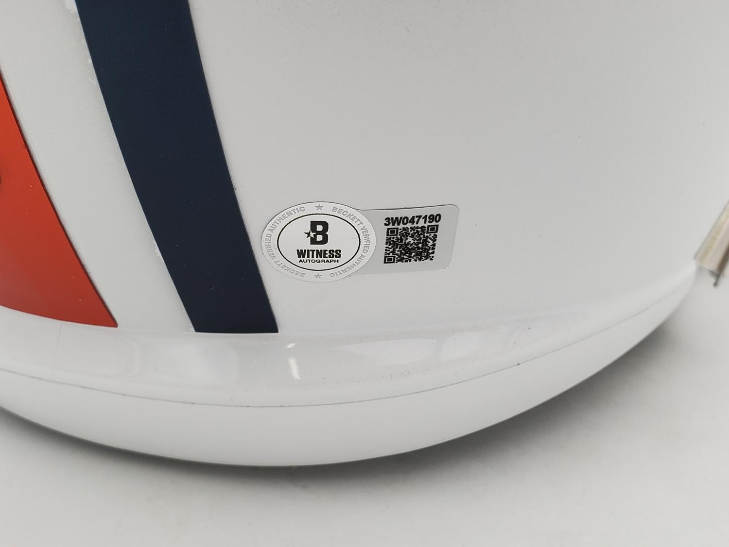 This autographed full size Riddell replica Speed helmet has been personally hand-signed by Bo Jackson of the Auburn Tigers. This autograph is certified by Beckett Authentication Services (BAS) Witness Certification. That means that a Beckett representative was present when this item was signed. It comes with the numbered authentication hologram with a QR code that verifies the authentication on the Beckett website. Please note, the hologram shifted slighty and left some behind, see the last picture.