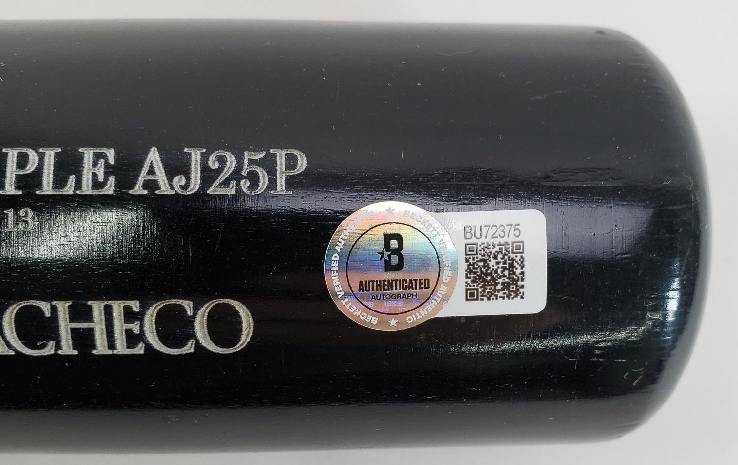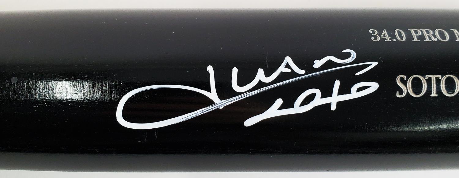 This autographed baseball bat has been personally hand-signed by Juan Soto of the New York Mets. This autograph is certified by Beckett Authentication Services (BAS). It comes with the numbered authentication hologram with a QR code that verifies the authentication on the Beckett website.