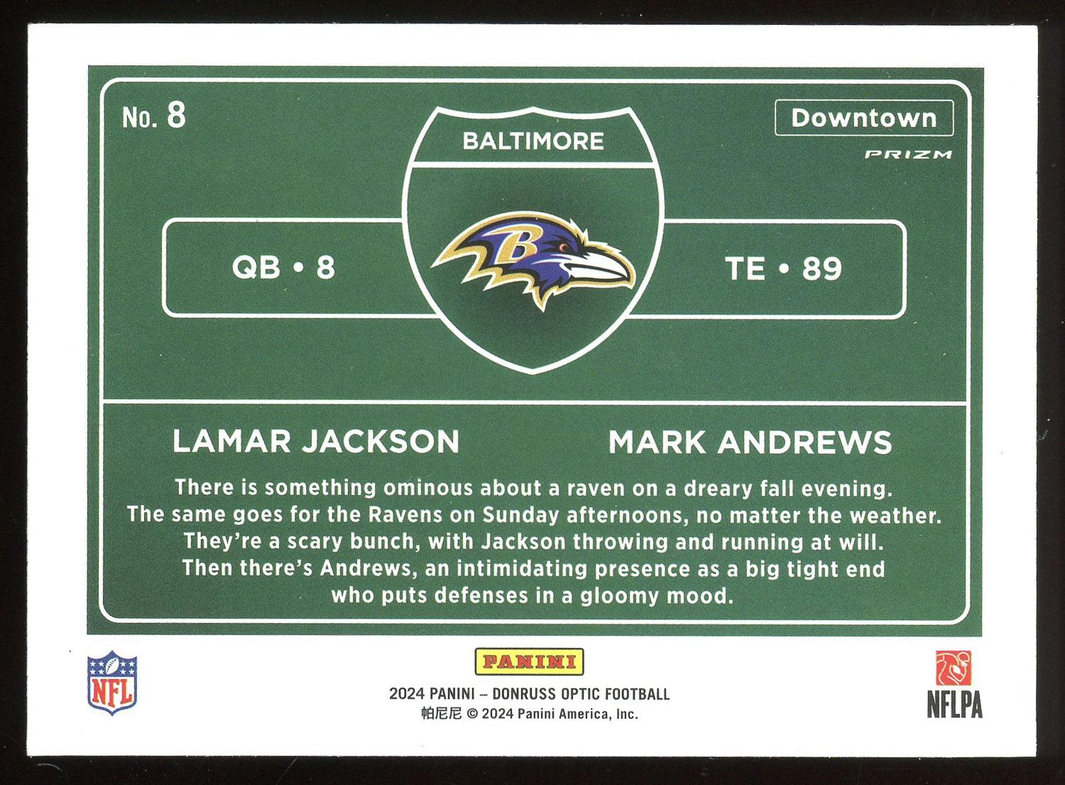 Lamar Jackson & Mark Andrews 2024 Panini Donruss Optic Downtown Horizontal Holo Card #8. Please see pictures for details on the condition of this card.