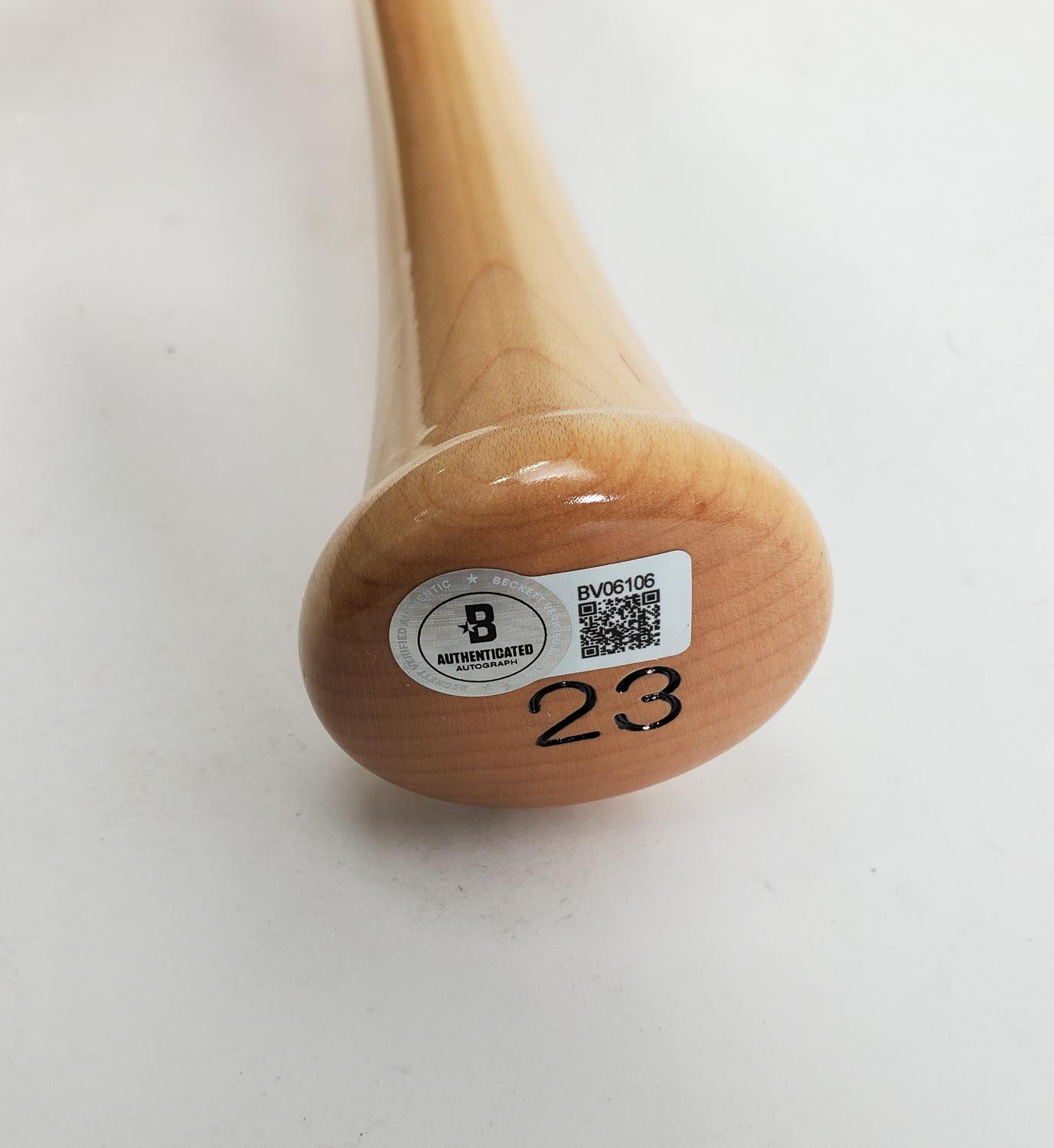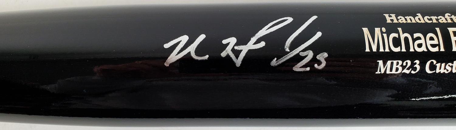 This autographed baseball bat has been personally hand-signed by Michael Brantley of the Cleveland Indians. This autograph is certified by Beckett Authentication Services (BAS). It comes with the numbered authentication hologram with a QR code that verifies the authentication on the Beckett website.