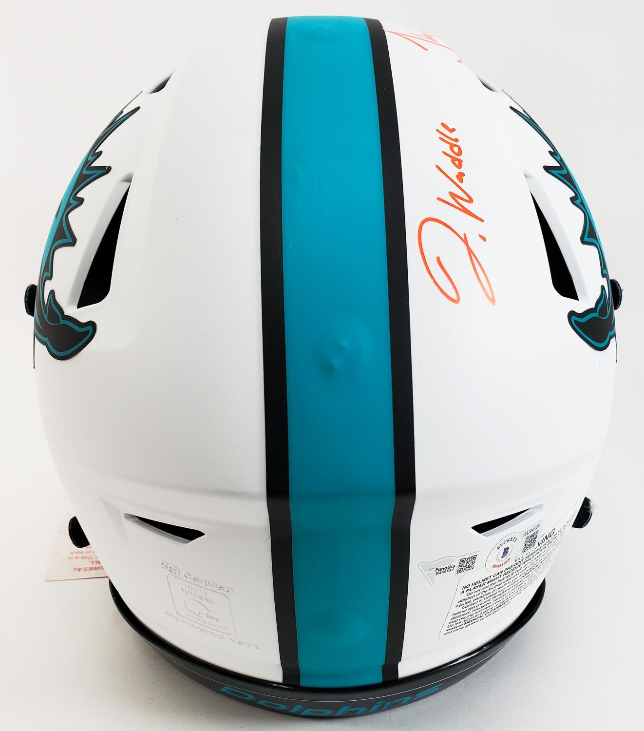 This autographed full size Riddell SpeedFlex authentic speed helmet has been personally hand-signed by Tua Tagovailoa, Tyreek Hill & Jaylen Waddle. The Tua & Waddle autographs are certified by Fanatics. It comes with the numbered hologram which can be verified on Fanatics.com. The Tyreek autograph is certified by Beckett Authentication Services (BAS) Witness Certification. That means that a Beckett representative was present when this item was signed. It comes with the numbered authentication hologram with a QR code that verifies the authentication on the Beckett website.