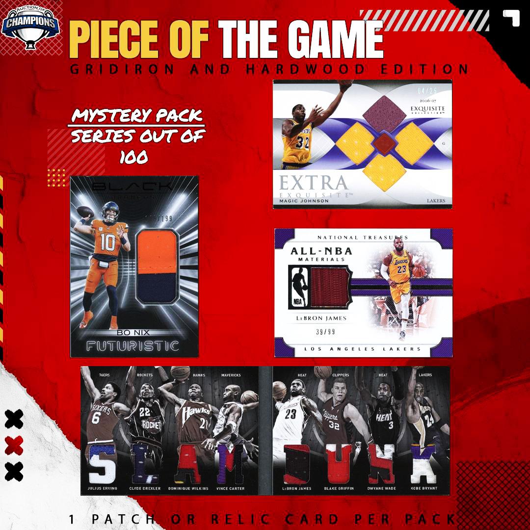 Piece of the Game: Gridiron & Hardwood Edition Mystery Pack- Grand Prize LeBron/Griffin/Wade/Bryant/Erving/Drexler/Wilkins/Carter 2011 Panini Preferred Game Used Patch /25!, other top hits: LeBron James 2018 National Treasures Patch /99!, Magic Johnson 2006 UD Exquisite Collection Quad Patch /25! Bo Nix 2025 Panini Black Futuristic Patch Card /199- Limited to (100) Boxes! One Patch Card Per Pack! Hits: LeBron James/Blake Griffin/Dwayne Wade/Kobe Bryant/Julius Erving/Clyde Drexler/Dominique Wilkins/Vince Carter 2011 Panini Preferred Game Used Patch /25!, other top hits: LeBron James 2018 National Treasures Patch /99!, Magic Johnson 2006 UD Exquisite Collection Quad Patch /25 and Bo Nix 2025 Panini Black Futuristic Patch Card /199! Also includes: Hall of Famers: (5) total; Marshall Faulk 2006 Fleer Ultra Achievements Jersey, Ray Allen 2006 Upper Deck Hardcourt Materials, Marvin Sapp 2003 Fleer Showcase Footballs Best, Isaac Bruce 2006 Topps DPP Underclassmen Class of 94, Julius Peppers 2006 Panini Prestige Gridiron Heritage Stars: (13) total: Shaun Alexander 2006 Playoff Prestige Gridiron Heritage, Mario Williams 2006 Upper Deck SPx Winning Materials, Torry Holt 2006 Playoff Prestige Stars of the NFL, James Cook 2024 Donruss Threads, Marcus Camby 2003 Upper Deck Sweet Spot Swatches, Byron Leftwich 2006 Fleer Showcase, Amani Toomer 2000 Fleer Feel the Game, Tank Dell 2024 Donruss Threads, Miles McBride 2025 Topps Swish & Stitch Relics, Jamal Lewis 2006 Donruss Gridiron Gear, Carnell Cadillac Williams 2010 Panini Threads Game Day Jerseys, Trent Green 2005 Upper Deck UD Game Jersey, LaMont Jordan 2008 Topps Game Worn Uniform Rookies: (71) total; Xavier Tillman 2020 Panini Court Kings Rookie Expression, Precious Achiuwa 2020 Panini Select, Killian Hayes 2020 Panini Select, GG Jackson 2023 Panini Contenders Rookie Ticket, Audric Estime 2024 Panini Contenders Rookie Ticket, Dallas Turner 2024 Panini Prizm Rookie Gear Silver Rookie Card, Jonathon Brooks 2024 Panini Prizm Premier Jerseys Silver, Bub Carrington 2024 Panini NBA Hoops, Adonai Mitchell 2024 Panini Absolute Rookie Force, Laiatu Latu 2024 Panini Prizm Pink Rookie Gear, Laiatu Latu 2024 Panini Prizm Rookie Gear, Adam Pacman Jones & Antrelle Rolle 2005 Upper Deck Reflections Cut From the Same Cloth Dual Patch, DayRon Sharpe 2021 Panini Contenders Rookie Ticket, JaLynn Polk 2024 Panini Prizm Premier Jerseys Silver, JaLynn Polk 2024 Panini Absolute Rookie Force Patch, JaLynn Polk 2024 Panini Rookies & Stars Year One, Khaman Maluach 2025 Topps Franchise Fabrics, Yves Missi 2024 Panini NBA Hoops Rise N Shine Dual Patch, Taylor Hendricks 2023 Panini Contenders Rookie Ticket, Ben Sheppard 2023 Panini Contenders Rookie Ticket, Kobe Brown 2023 Panini Contenders Rookie Ticket, Matt Schaub 2004 Fleer Patch /75, E.J. Manuel 2013 Panini Absolute NFL Rookie Patch, Braelon Allen 2024 Panini Rookies & Stars Year One Patch, Jarace Walker 2024 Panini Contenders Rookie Ticket, Antonio Pittman 2007 SAGE Hit Patch Card, Mario Manningham 2009 Playoff Prestige Rookie Review, Kai Jones 2021 Panini NBA Hoops Rise N Shine, Drew Gooden 2004 Upper Deck Artifacts, Kam Jones 2025 Topps Franchise Fabrics Rookie Card, Kenny Irons 2007 SA GE Hit Patch Card, Troy Franklin 2024 Panini Prizm Rookie Gear Silver, Jermaine Burton 2024 Panini Rookies & Stars Year One, Thaddeus Young 2008 Bowman Draft Picks & Stars, Yernand Morency 2005 Upper Deck Portraits Scrapbook Materials Card, LenDale White 2006 Upper Deck SPx Winning Materials, LenDale White 2006 Upper Deck SPx Winning Materials, LenDale White 2006 Upper Deck SPx Swatch Supremacy, DeAngelo Williams 2006 Upper Deck SPx Swatch Supremacy, Leon Washington 2006 Upper Deck SPx Winning Materials, Javon Baker 2024 Panini Illusions Great Expectations, Bilal Coulibaly 2023 Panini Contenders Rookie Ticket, Kyle Boller 2006 Upper Deck Star Materials, Jace Amaro 2014 Panini Rookies & Stars Longevity /299, Leon Washington 2006 Upper Deck Star Materials, Mark Clayton 2005 Topps Draft Picks & Prospects, Terence Shannon Jr. 2024 Panini NBA Hoops Rise N Shine, Mercedes Lewis 2004 SPx Swatch Supremacy, Shane Larkin 2013 Panini Titanium Rookie Patch /325, Harry Giles 2017 Panini Donruss Rookie Jerseys, (2) Kellen Clemens 2006 Upper Deck SPx Winning Materials, Kellen Clemens 2006 Upper Deck Future Star Materials, Kellen Clemens 2006 Bowman Mitchell & Ness Throwback, Ciatrick Fason 2005 Playoff Absolute Rookie Jersey Collection, Eric Shelton 2005 Bowman Throwback Threads, Earl Everett 2007 Topps DPP, Brandon Williams 2006 Upper Deck Rookie Futures, Charlie Whitehurst 2006 Upper Deck Rookie Futures, Michael Floyd 2012 Rookies & Stars Longevity Materials /249, Onterrio Smith 2003 Upper Deck Finite Jerseys, B.J. Mullens 2009 Upper Deck Jordan Classic Draft Edition, Devin Harris 2005 Upper Deck Rookie Debut Sizzling Swatches, Dominique Byrd 2006 Topps DPP, Jesse Maholena 2006 Topps DPP, Ryan St. Pierre 2003 Upper Deck Rookie Futures, Reggie Williams 2004 Fleer Rookie Throwback Threads, Quentin Griffin 2003 Fleer Platinum Alma Materials, Derek Abney 2004 Topps Bazooka College Collection, Kevin OConnell 2008 SP Authentic Rookie Authentics Jersey. Other cards: (7) total; Keith Brookings 2006 Topps All Pro Bowl, Mike Williams 2006 UD Game Jersey, Rodney Rodgers 2005 SP Game Used Edition, Charles Rodgers 2006 Upper Deck Kickoff Jerseys, Ryan Matthews 2015 Panini Spectra /99, Domanick Davis 2004 SP Game Used Edition, Johnny Morton & Herman Moore 2001 Pacific Vanguard Double Sided Patch. All 100 packs will be auctioned off exclusively at AuctionofChampions.com. Each pack will contain one (1) basketball or football patch card, with many representing parallels or various tiered subsets. This series is loaded with premium patch cards and has many hits, including a scattering of rookies, Hall of Famers and stars. All 100 cards are packed individually, there is no guarantee as to which of the 100 cards listed above that you will receive as cards were packed 
