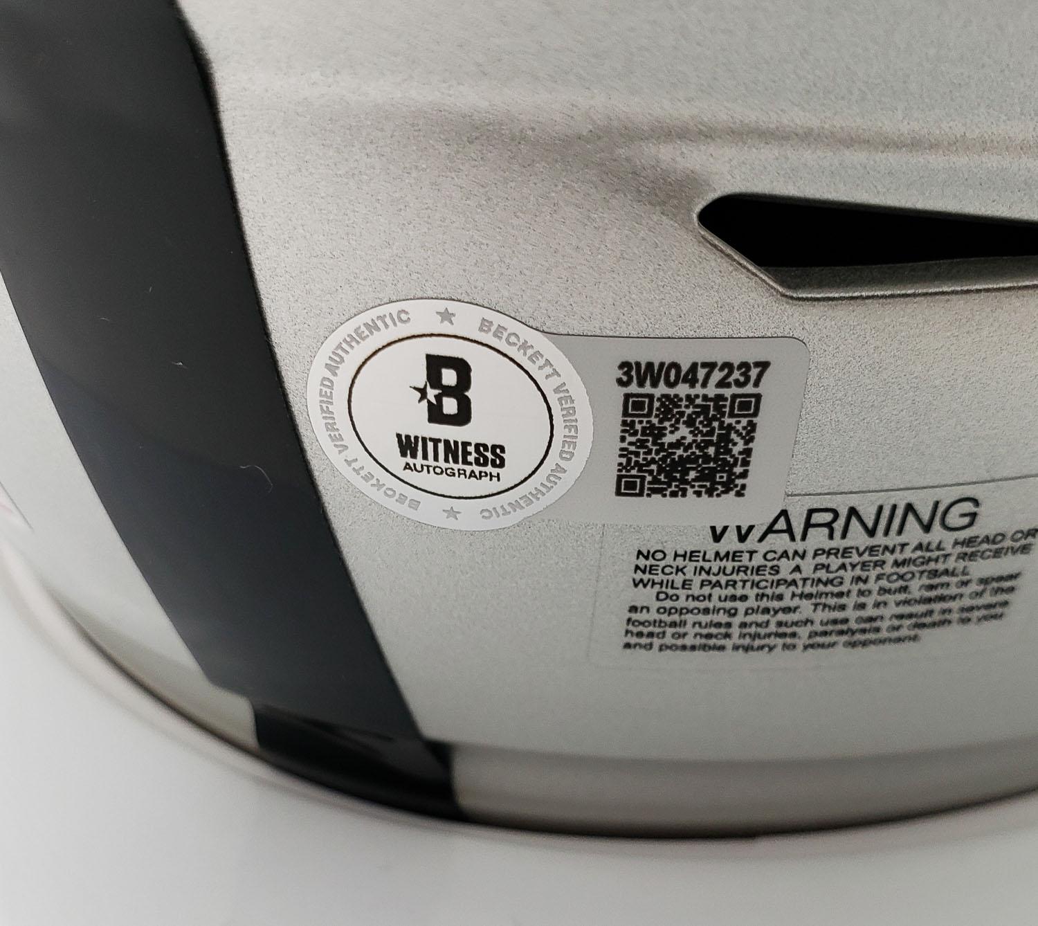 This autographed Riddell mid size MIDI helmet has been personally hand-signed by Bo Jackson of the Oakland Raiders. This autograph is certified by Beckett Authentication Services (BAS) Witness Certification. That means that a Beckett representative was present when this item was signed. It comes with the numbered authentication hologram with a QR code that verifies the authentication on the Beckett website. Stock images are used for this listing. The item you will receive will be of equal quality to the one pictured. The signature location may vary slightly.