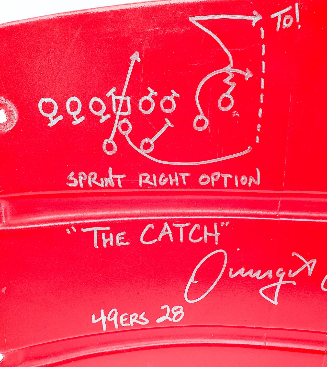 This autographed seatback has been personally hand-signed by Joe Montana & Dwight Clark of the San Francisco 49ers. Clark added a Hand Drawn Play Sketch of The Catch play. He also added the following inscriptions: "Spring Right Option", "The Catch", "49ers 28 Dallas 27" and "1.10.82". This autograph is certified by Fanatics. It comes with the numbered hologram which can be verified on Fanatics.com.