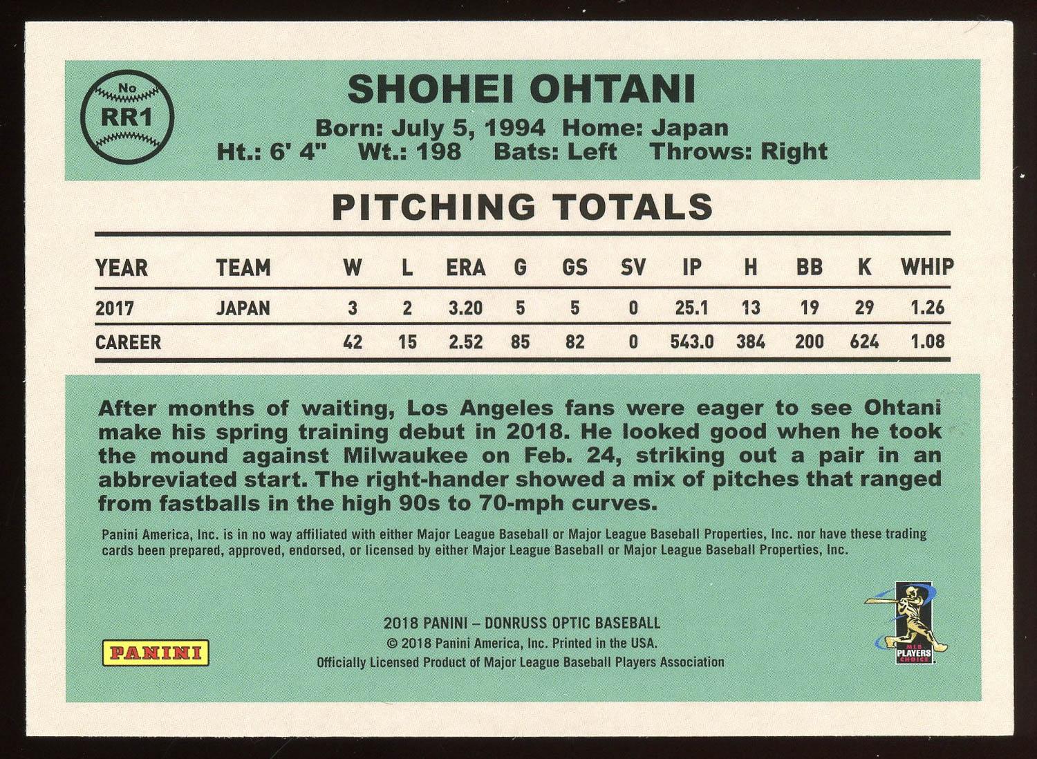 Shohei Ohtani 2018 Panini Donruss Optic Rated Rookie Card #1. Please see pictures for details on the condition of this card.