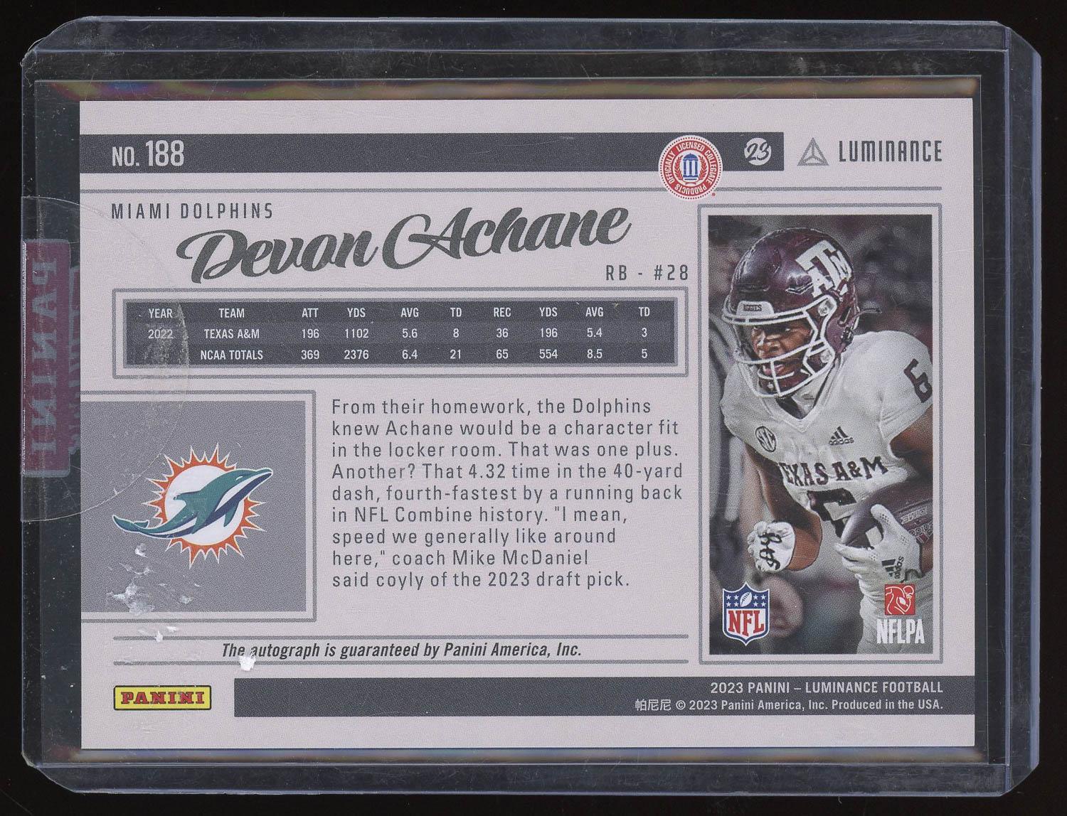 De'Von Achane 2023 Panini Luminance Rewards Rookie Auto Card /350. Please see pictures for details on the condition of this card.