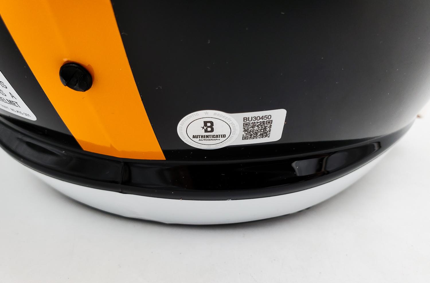 This autographed full size helmet has been personally hand-signed by Terry Bradshaw of the Pittsburgh Steelers. This autograph is certified by Beckett Authentication Services (BAS) Certification. It comes with the numbered authentication hologram with a QR code that verifies the authentication on the Beckett website.