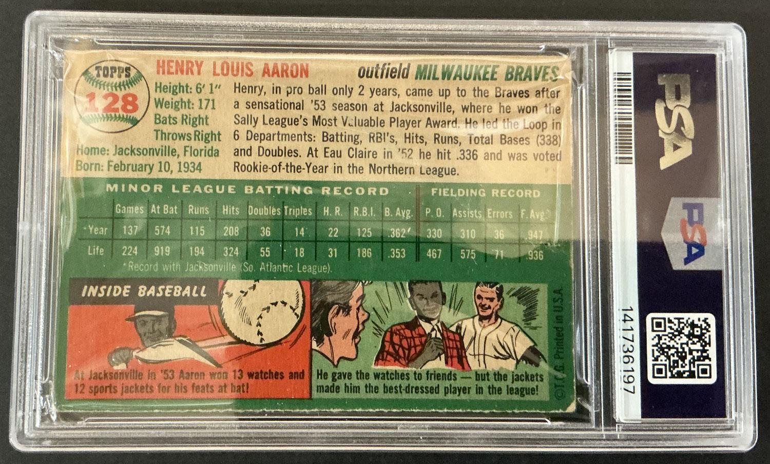 This is a Hank Aaron (as a member of the Milwaukee Braves) 1954 Topps Rookie Baseball card. Hank Aaron 1954 Topps Rookie Card PSA 1.5.