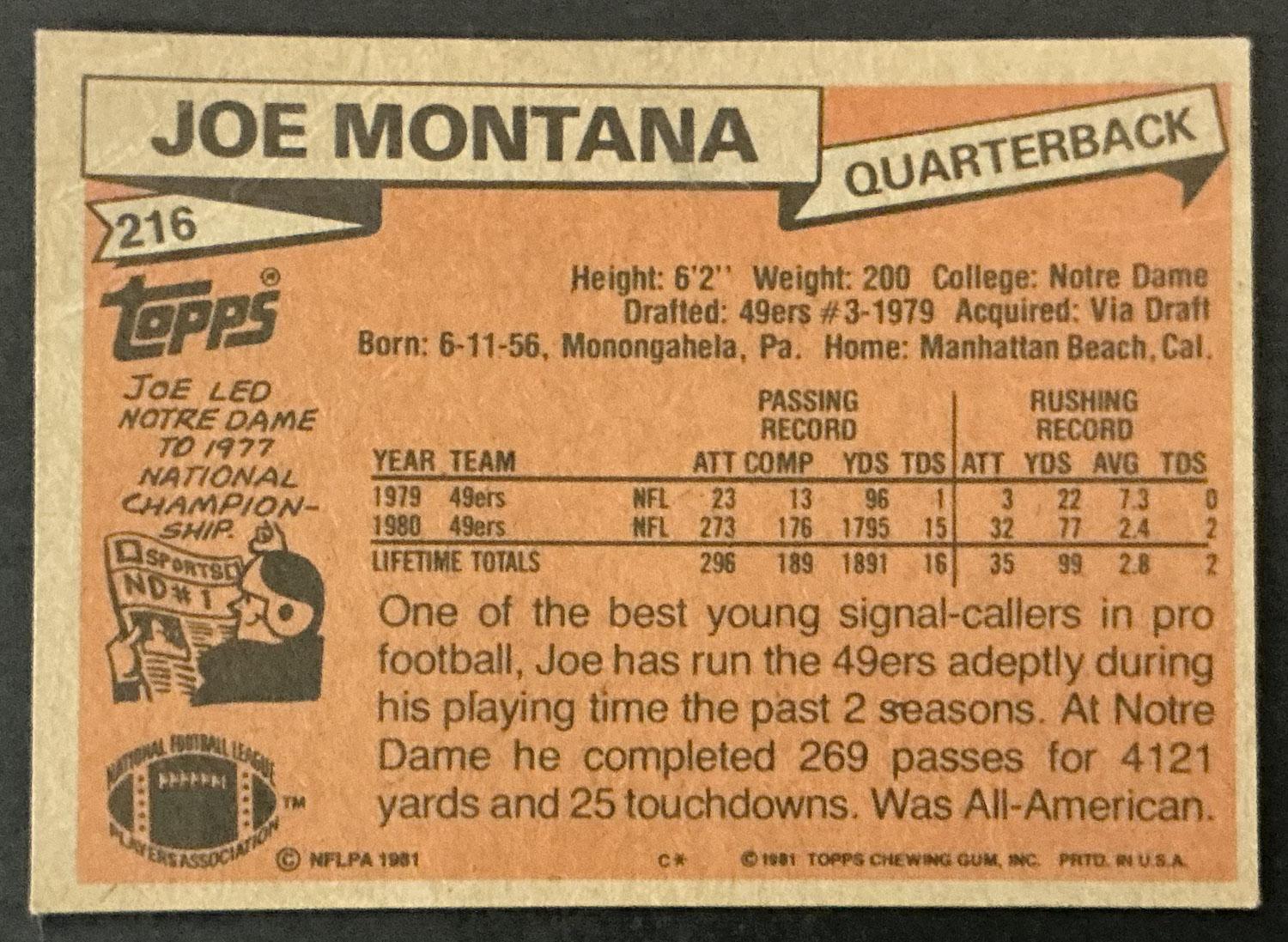 Joe Montana 1981 Topps Rookie Card #216