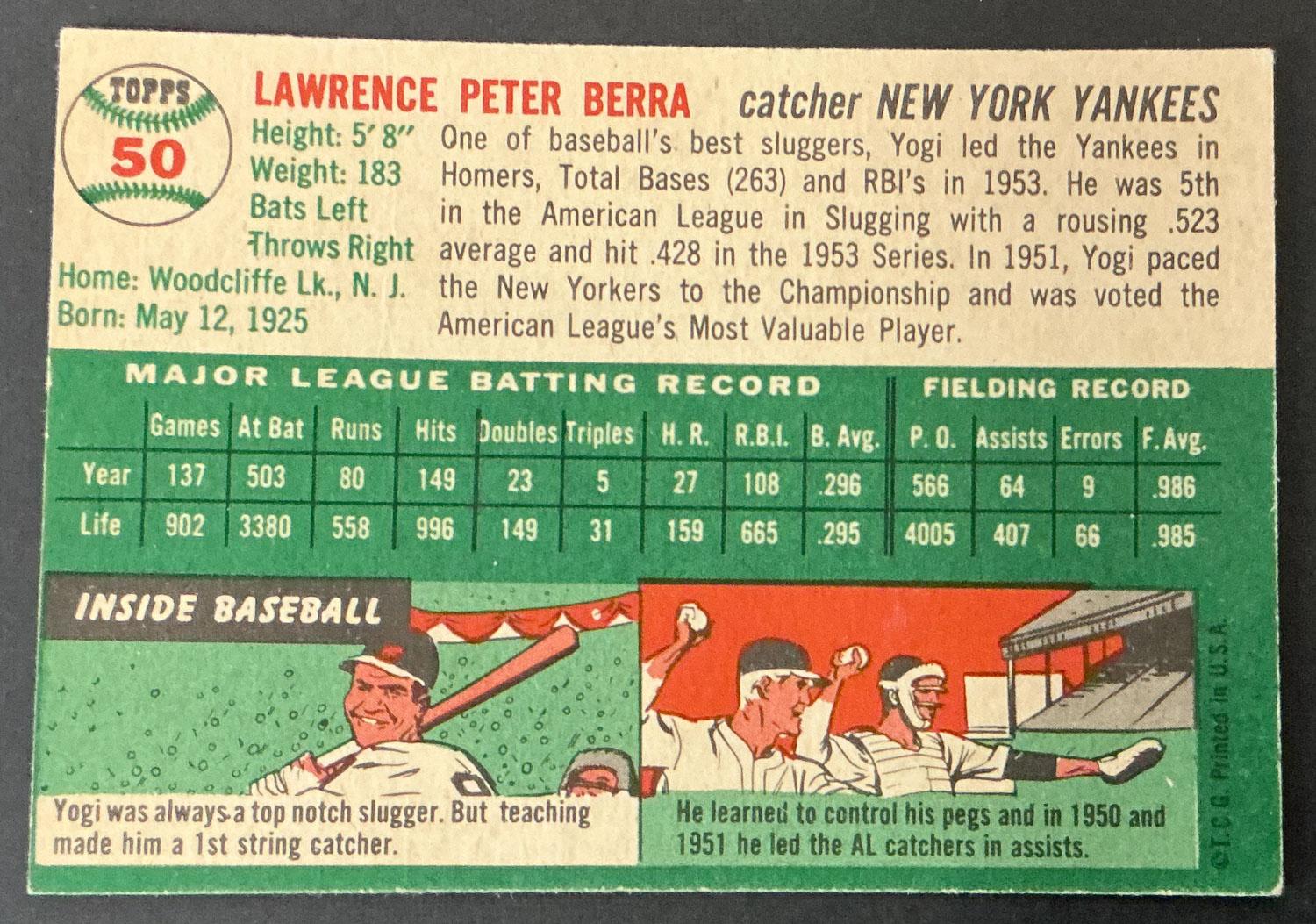 This is a Yogi Berra (as a member of the New York Yankees) 1954 Topps Baseball card. This card has not been autographed nor graded. Please see pictures for details on the condition of this card.