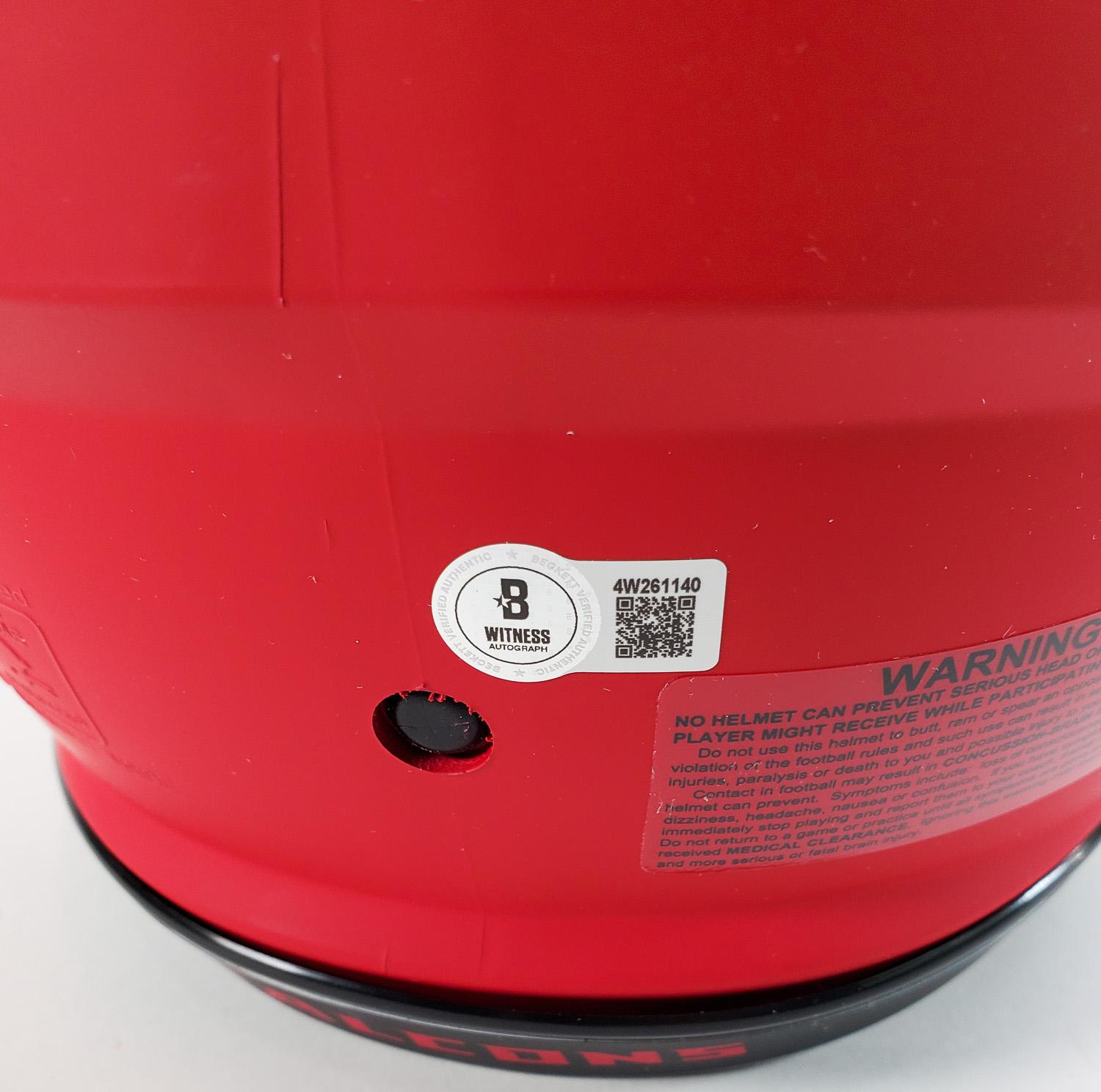 This autographed full size Riddell Authentic Speed helmet has been personally hand-signed by Bijan Robinson of the Atlanta Falcons. This autograph is certified by Beckett Authentication Services (BAS) Witness Certification. That means that a Beckett representative was present when this item was signed. It comes with the numbered authentication hologram with a QR code that verifies the authentication on the Beckett website. Please note, there are a few scuff marks on the Falcons logo which can be seen in the main picture.