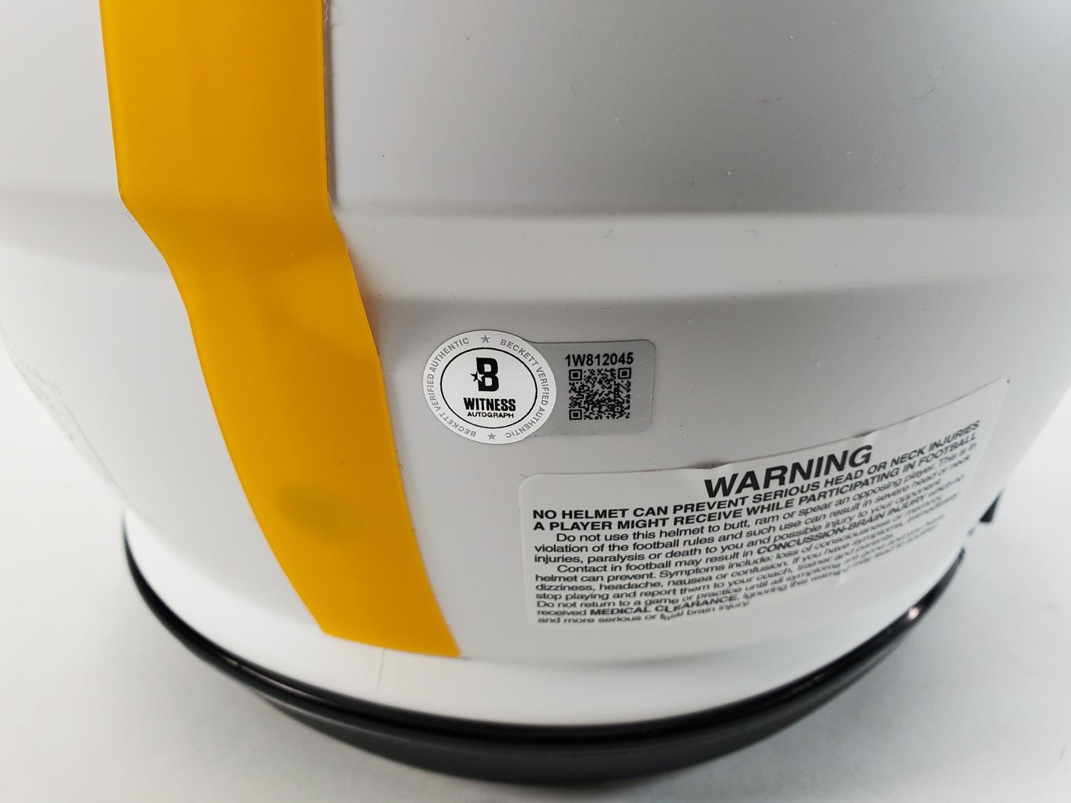 This autographed full size Riddell Authentic Speed helmet has been personally hand-signed by Roman Wilson of the Pittsburgh Steelers. This autograph is certified by Beckett Authentication Services (BAS) Witness Certification. That means that a Beckett representative was present when this item was signed. It comes with the numbered authentication hologram with a QR code that verifies the authentication on the Beckett website.