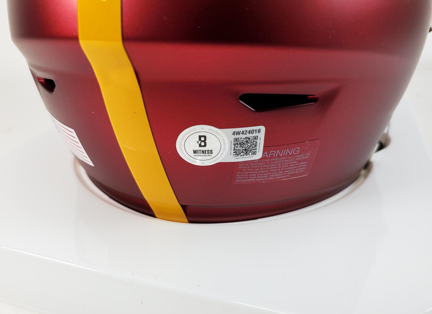 This autographed Riddell mid size MIDI helmet has been personally hand-signed by Joe Theismann "83 MVP" of the Washington Redskins. This autograph is certified by Beckett Authentication Services (BAS) Witness Certification. That means that a Beckett representative was present when this item was signed. It comes with the numbered authentication hologram with a QR code that verifies the authentication on the Beckett website.