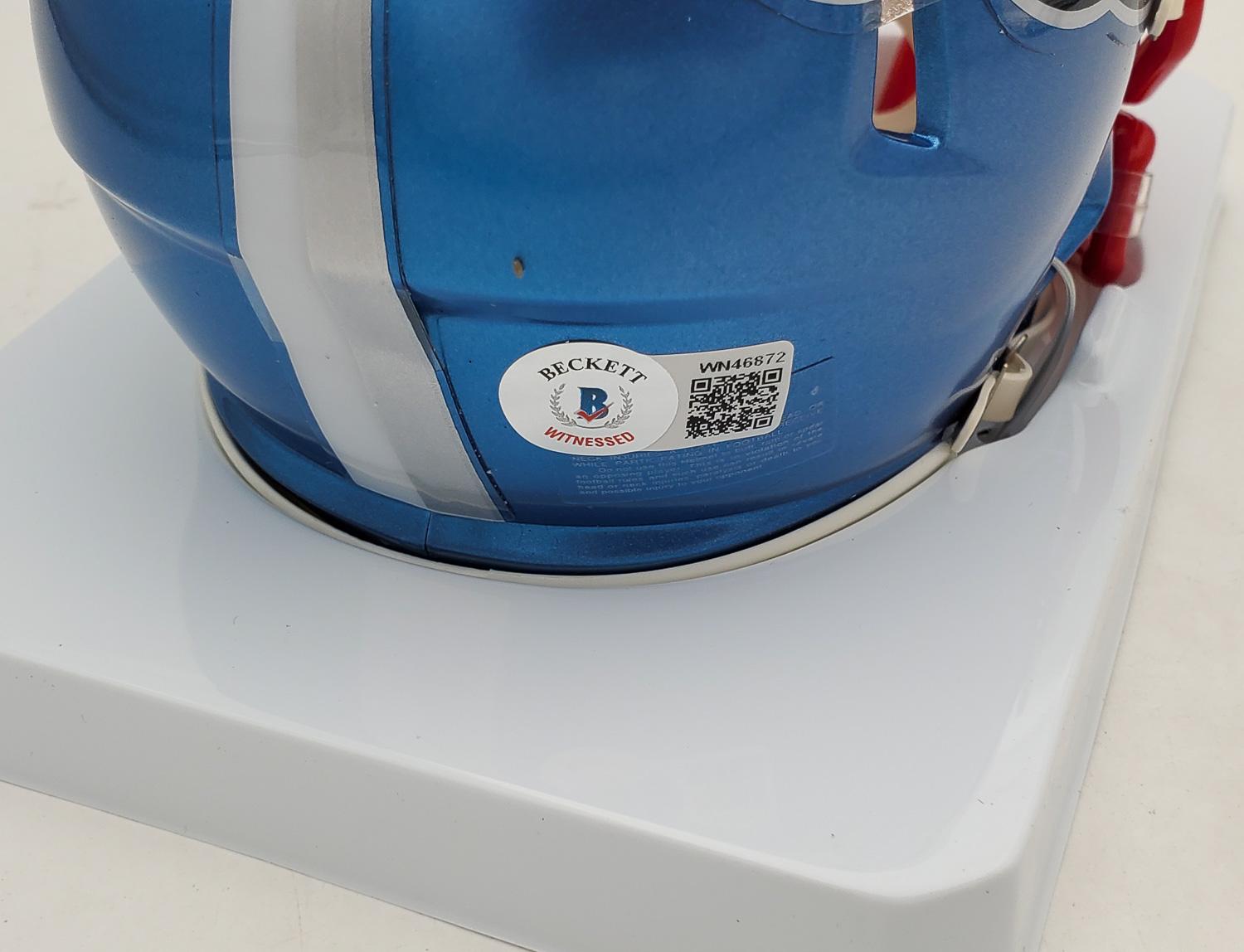 This autographed mini helmet has been personally hand-signed by Ryan Tannehill of the Tennessee Titans. This autograph is certified by Beckett Authentication Services (BAS) Witness Certification. That means that a Beckett representative was present when this item was signed. It comes with the numbered authentication hologram with a QR code that verifies the authentication on the Beckett website.