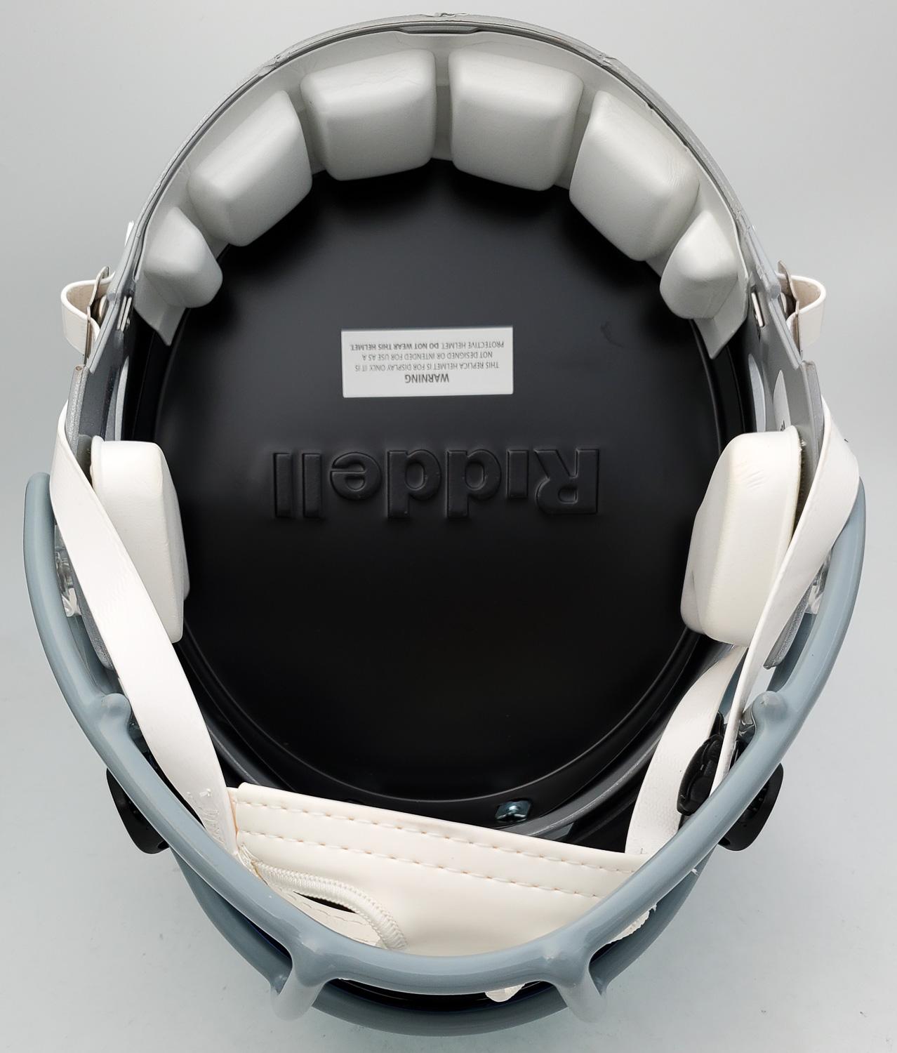 This autographed full size Riddell replica Speed helmet has been personally hand-signed by Geno Smith of the Las Vegas Raiders. This autograph is certified by Beckett Authentication Services (BAS) Witness Certification. That means that a Beckett representative was present when this item was signed. It comes with the numbered authentication hologram with a QR code that verifies the authentication on the Beckett website.